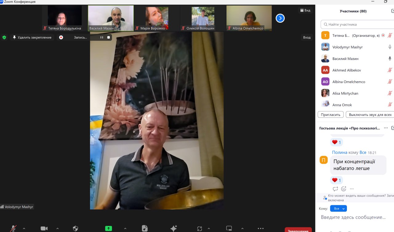 В онлайн-лекції взяли участь близько 90 гостей, серед яких були не тільки здобувачі всіх курсів бакалаврату і магістратури ОПП «Психологія», але й професійні спортсмени, студенти-психологи з інших українських університетів, а також всі, хто зацікавився темою.