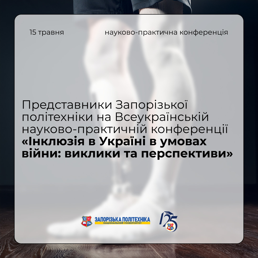 15 травня пройшла Всеукраїнська науково-практична конференція на тему «Інклюзія в Україні в умовах війни: виклики та перспективи». НУ «Запорізька політехніка» був одним з організаторів заходу, разом з партнерами: Відкритий міжнародний університет розвитку людини «Україна», Хмельницький інститут соціальних технологій Університету «Україна», Карпатський інститут підприємництва Університету «Україна», Волинський національний університет імені Лесі Українки, Луганський національний університет імені Тараса Шевченка, Кам'янець-Подільський національний університет імені Івана Огієнка та Хмельницький національний університет.