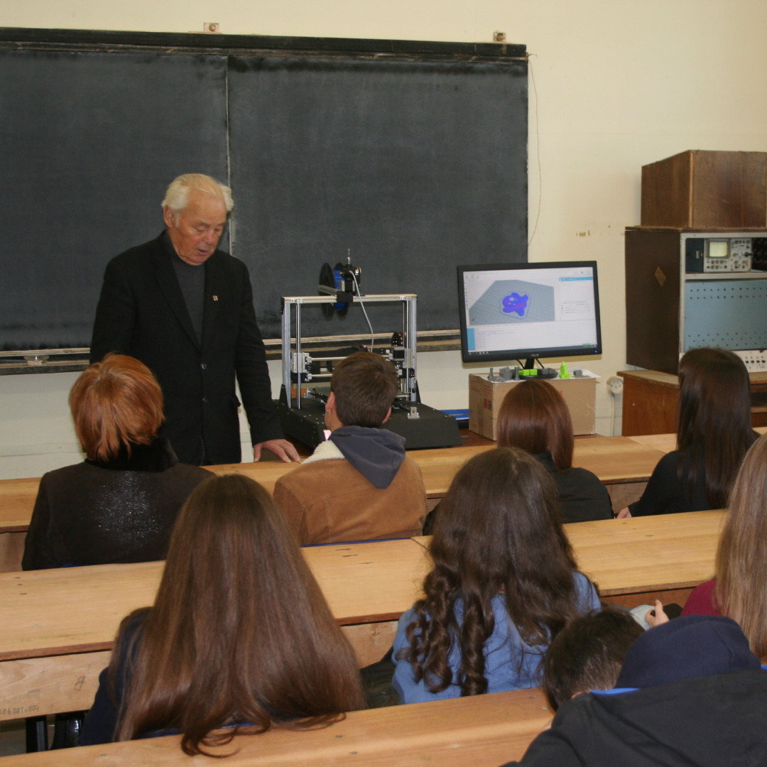 Доцент кафедри Володимир Василевський ознайомив учнів з технологіями використання 3D-принтерів та презентував їм деталь, створену на 3D-принтері під час заняття, а також розповів деталі вступу до Національного університету «Запорізька політехніка».