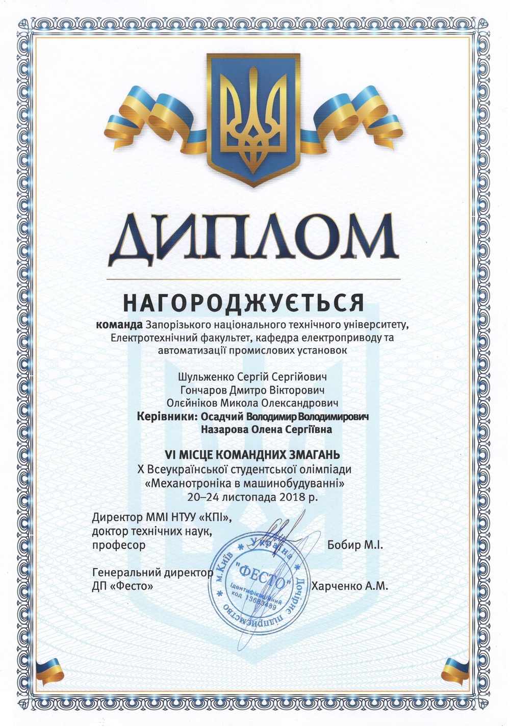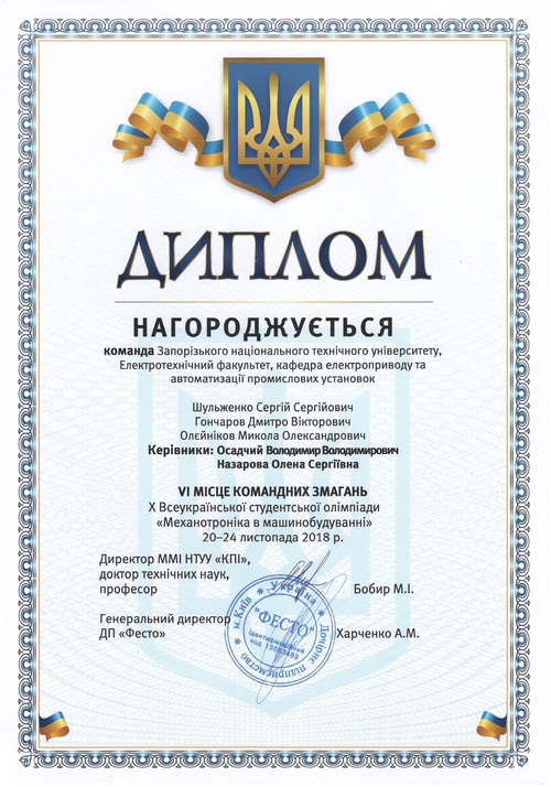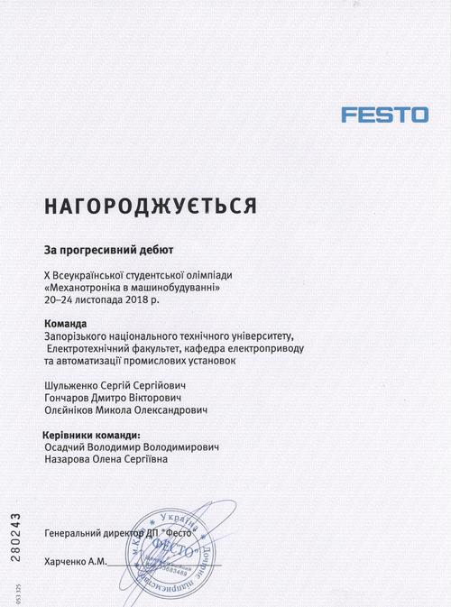 Беручи до уваги досить вдалі результати першої участі нашої команди у олімпіаді, генеральний директор ДП «Фесто» Харченко А.М. вручив команді Сертифікат «За прогресивний дебют», який команда може використати на отримання необхідної літератури або на проходження навчання у Фесто одного із членів команди.