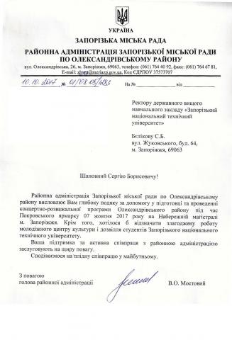 Районна адміністрація Запорізької міської ради по Олександрівському району висловлює глибоку подяку Сергію Борисовичу Бєлікову за допомогу у підготовці та проведенні концертно-розважальної програми Олександрівського району під час Покровського ярмарку 07 жовтня 2017 року на Набережній магістралі м. Запоріжжя. Крім того відзначає злагоджену роботу молодіжного центру культури і дозвілля студентів Запорізького національного технічного університету.