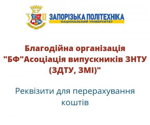 Продовжуємо підтримувати наших військових, територіальну оборону та тих, хто звертається до нас за допомогою. Знаємо, що тисячі наших випускників за межами нашої країни також прагнуть допомагати, тим самим наближаючи нашу спільну перемогу, і це підтверджують їх численні звернення! Благодійна організація «Благодійний фонд «Асоціація випускників ЗНТУ (ЗДТУ, ЗМІ) запрошує випускників Національного університету «Запорізька політехніка» та усіх бажаючих долучитися до збору коштів, що будуть витрачені на потреби захисту, оборони та відновлення.