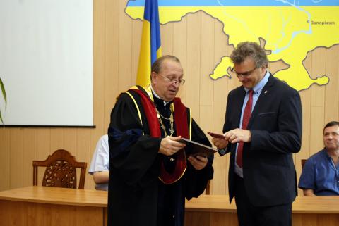 Ректор університету проф. Сергій Борисович Бєліков відзначив важливість міжнародної співпраці для викладачів та студентів ЗНТУ та за видатні досягнення та суттєвий вклад в розвиток освіти, науки та міжнародну співпрацю ЗНТУ урочисто вручив Пітеру Аррасу диплом почесного професора Запорізького національного технічного університету.