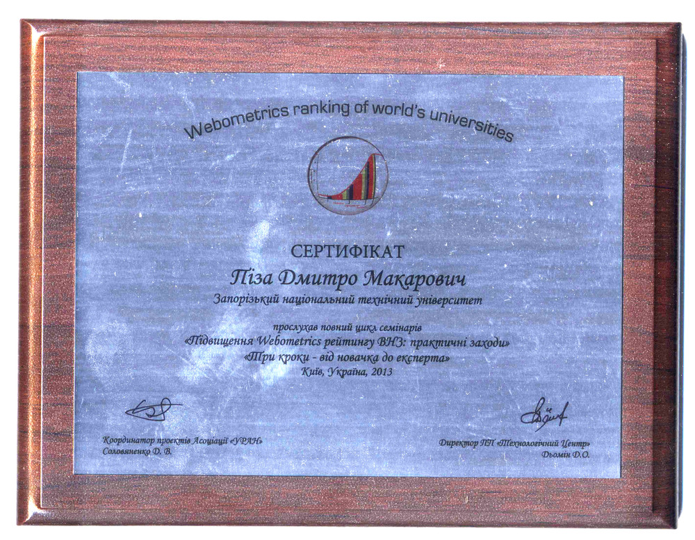 За результатами семінару учасники всіх трьох рівнів отримали сертифікати «Підвищення Webometrics рейтингу ВНЗ: практичні заходи» «Три кроки – від новачка до експерта». Від Запорізького національного технічного університету сертифікат отримав проректор з науково-педагогічної роботи та питань перспектив розвитку університету Дмитро Макарович Піза.