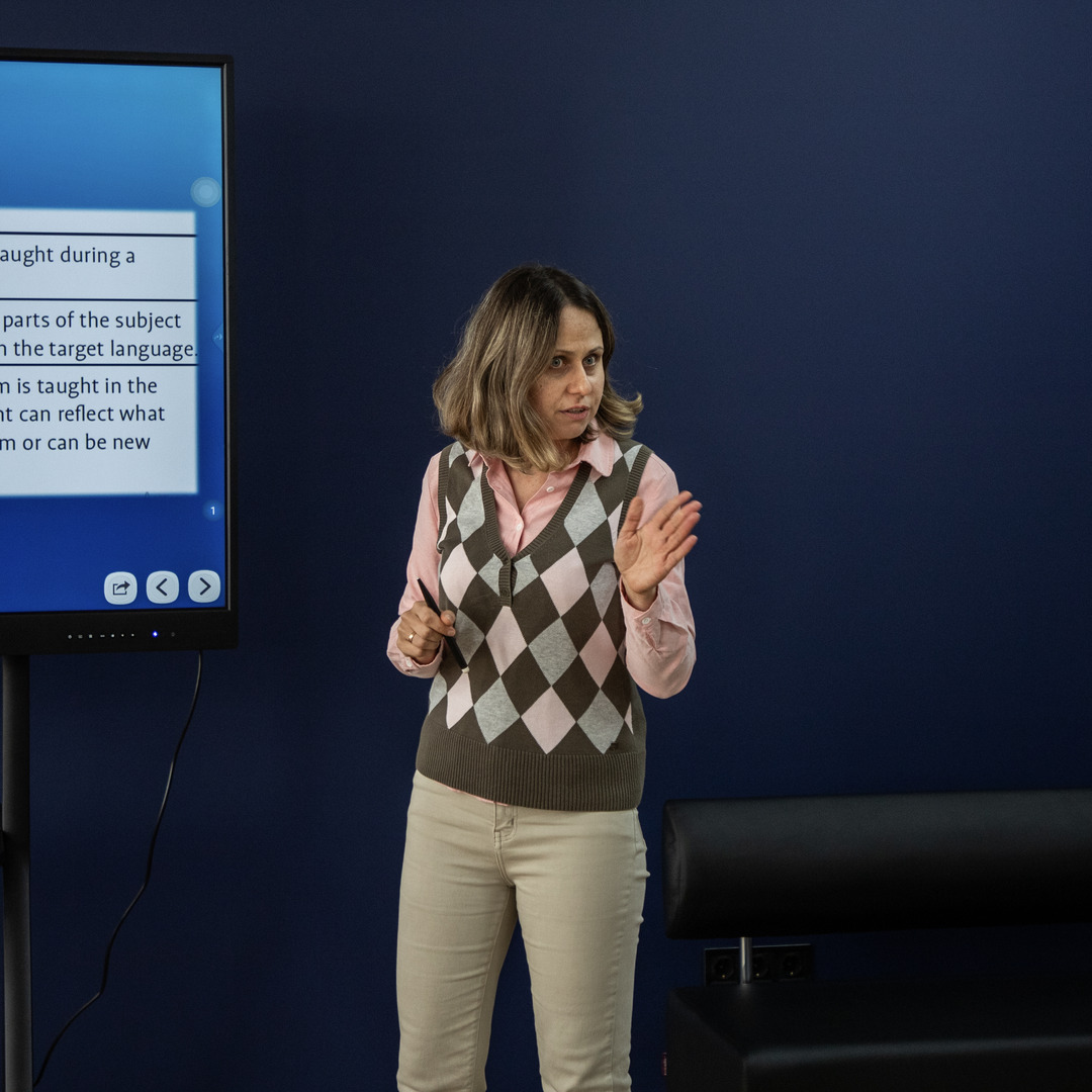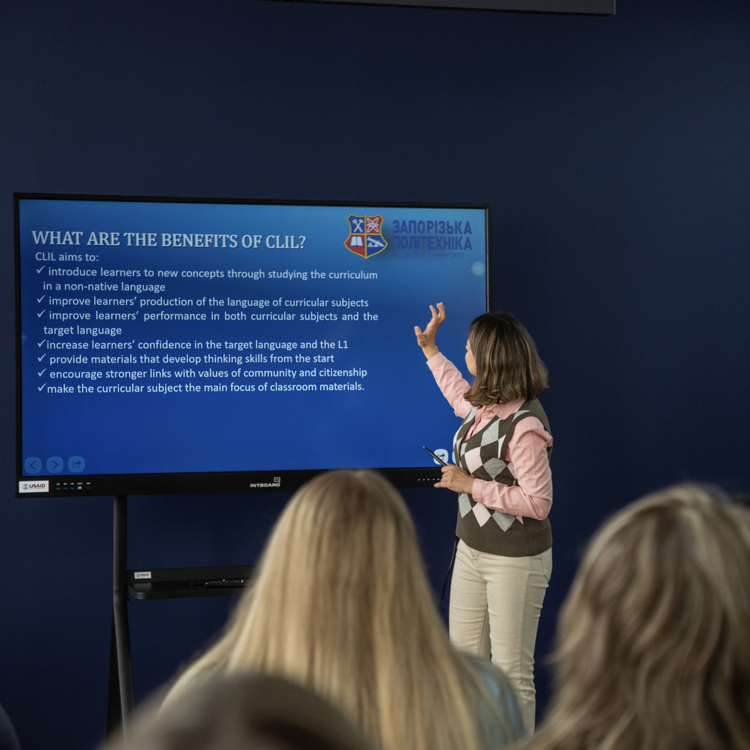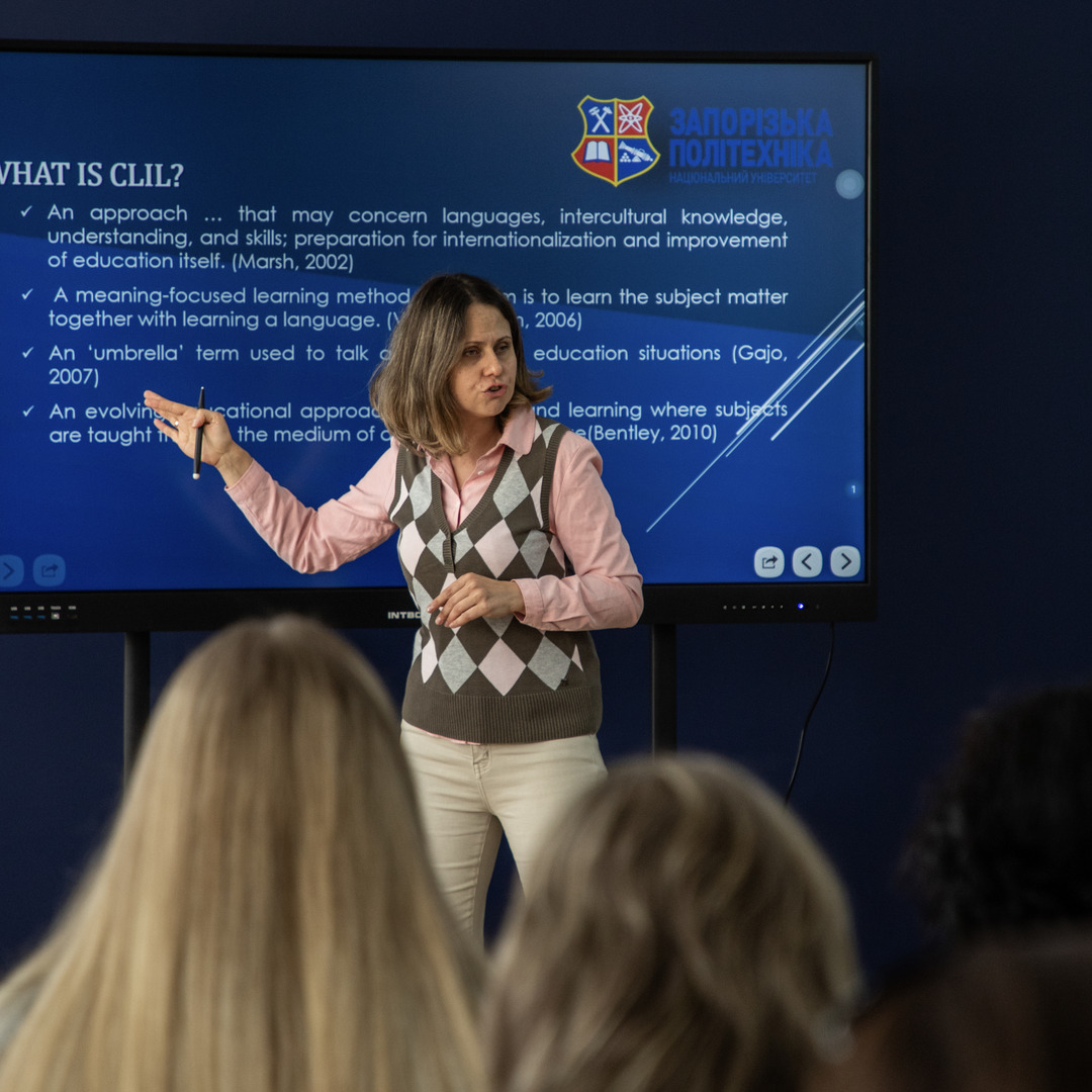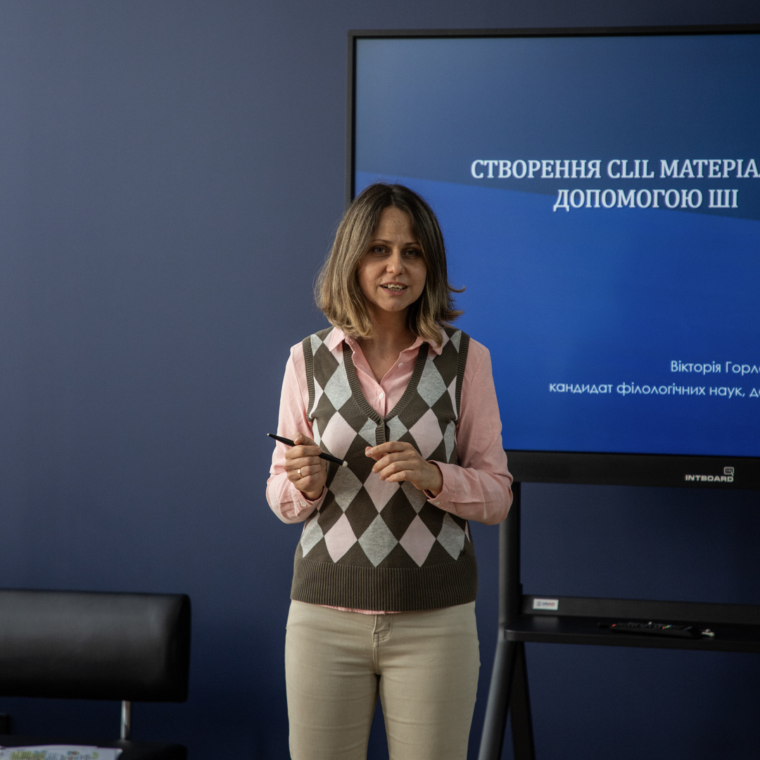 Доцентка кафедри іноземної філології та перекладу Вікторія Горлачова під час тренінгу «Створення CLIL матеріалів за допомогою ШІ для викладання іноземних мов» презентував вчителям способи зробити уроки іноземної мови інтерактивними, цікавими й технологічними. Вчителі освоювали, як створювати матеріали з огляду на міжпредметні зв'язки, як ефективно застосовувати медіаресурси та, що найважливіше в сучасному світі, як використовувати ШІ для створення унікальних ефективних навчальних матеріалів.