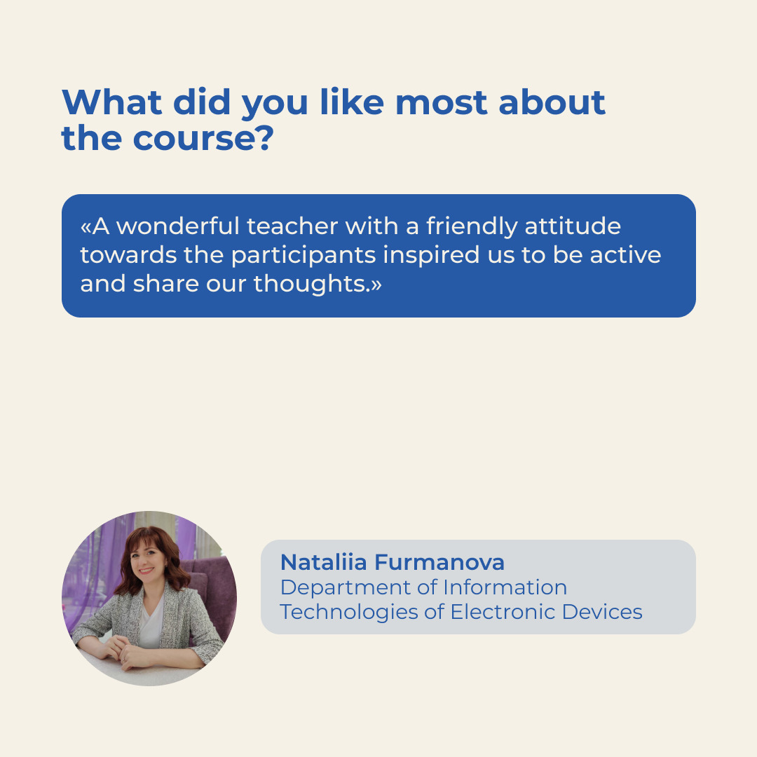 A wonderful teacher with a friendly attitude towards the participants inspired us to be active and share our thoughts.