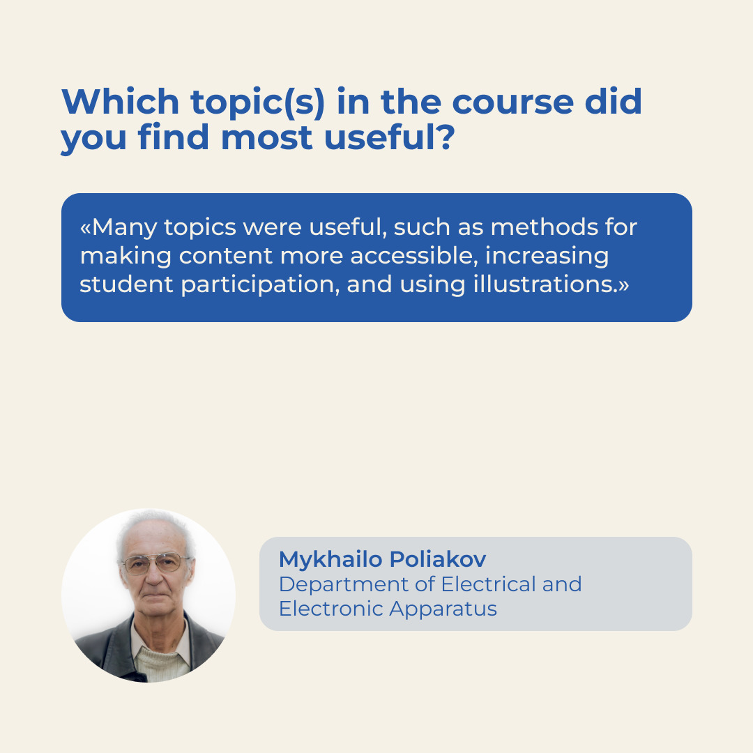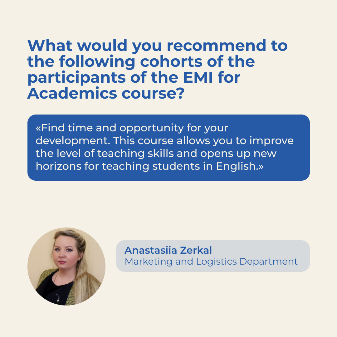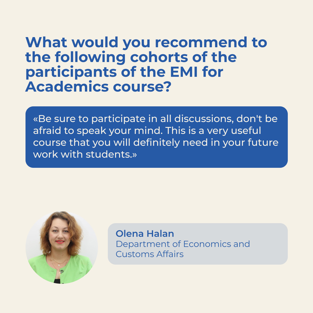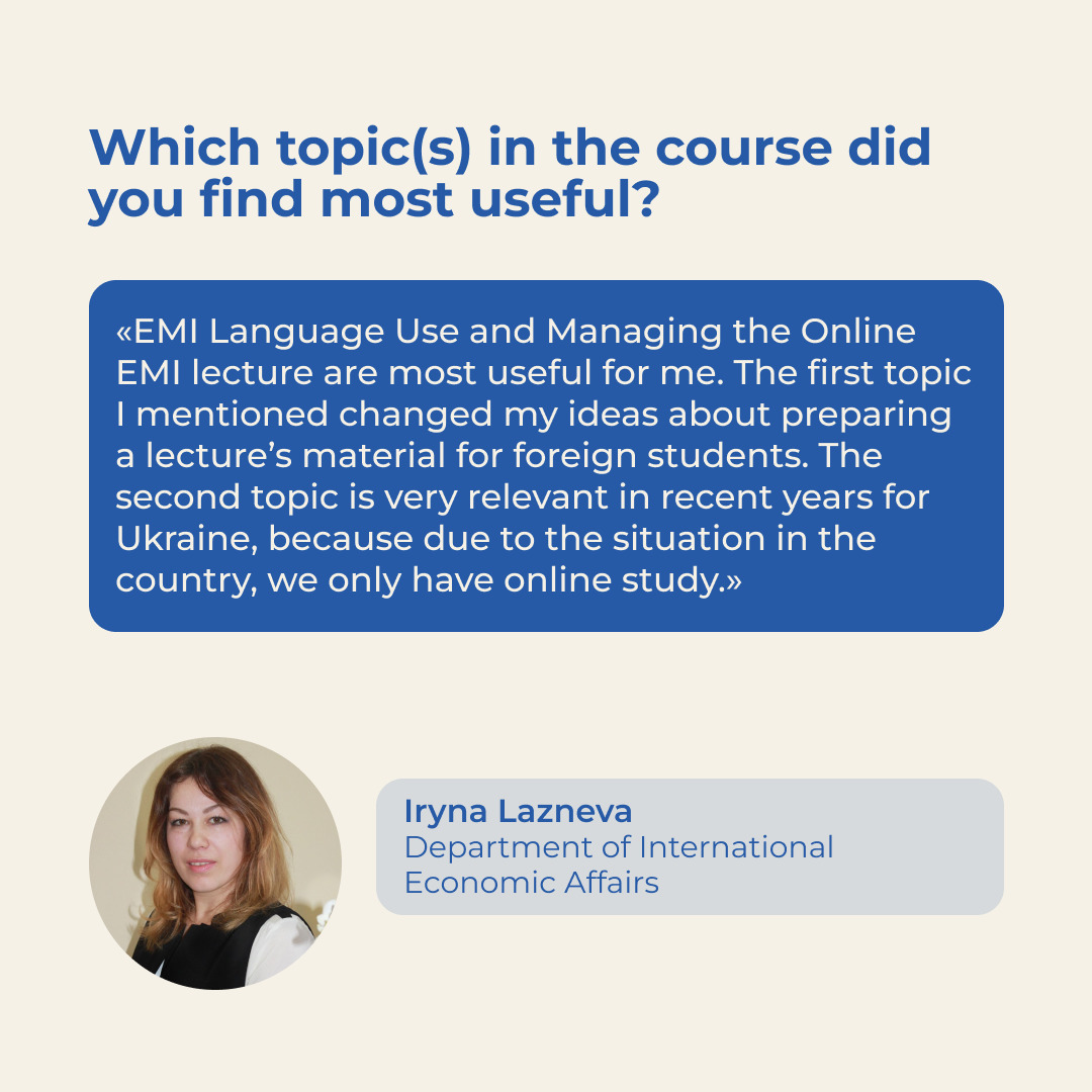 All the topics of the course were interesting and complemented each other. Particularly interesting were topics about the specifics of EMI Language for Lectures and for Seminars, about assessing students' knowledge, about the interaction of learning and emotions.