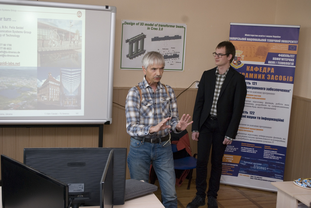 Доцент кафедри програмних засобів А.В. Пархоменко та доцент кафедри електричних апаратів М.О. Поляков зробили презентації щодо поточного стану та перспектив співпраці між ЗНТУ та Технічним Університетом Ільменау.