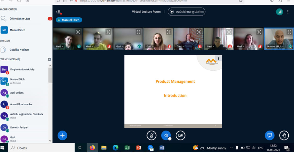 Організаційні збори щодо старту проєкту відбулись 13 березня 2023 р. за участі координаторки програми «Цифрові технології та менеджмент» Східно-Баварського університету Амберг-Вайден Емі де Вур-Шон і координаторів від НУ «Запорізька політехніка» д.е.н. Катерини Антонюк і д.е.н. Дмитра Антонюка. Студентів і викладачів ознайомили з особливостями цифрового освітнього процесу, який стартував в університеті Німеччини з 16 березня.