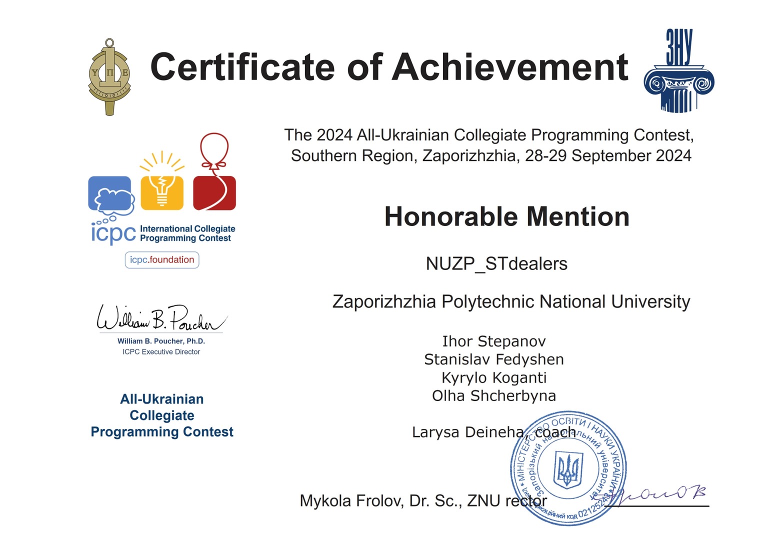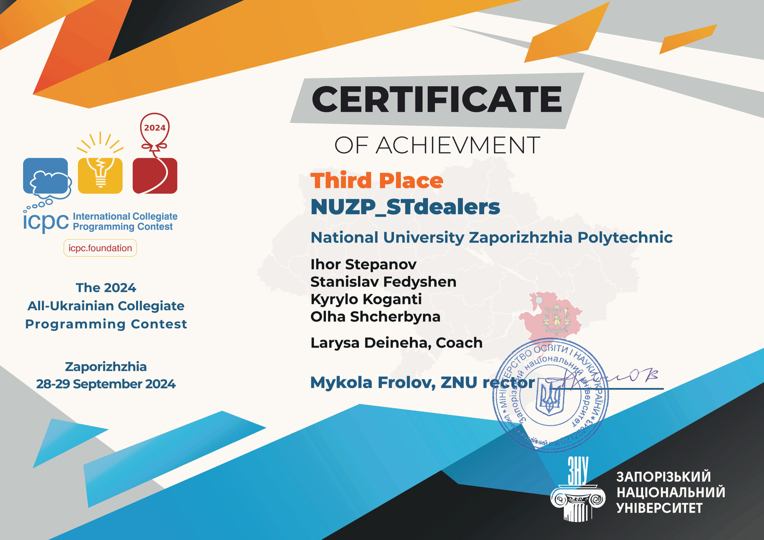 - команда NUZP_STdealers (Ігор Степанов, КНТ-112, Станіслав Федишен, КНТ-112, Кирило Коганті, КНТ-122, Ольга Щербина, КНТ-121, тренер — старша викладачка Лариса Дейнега)