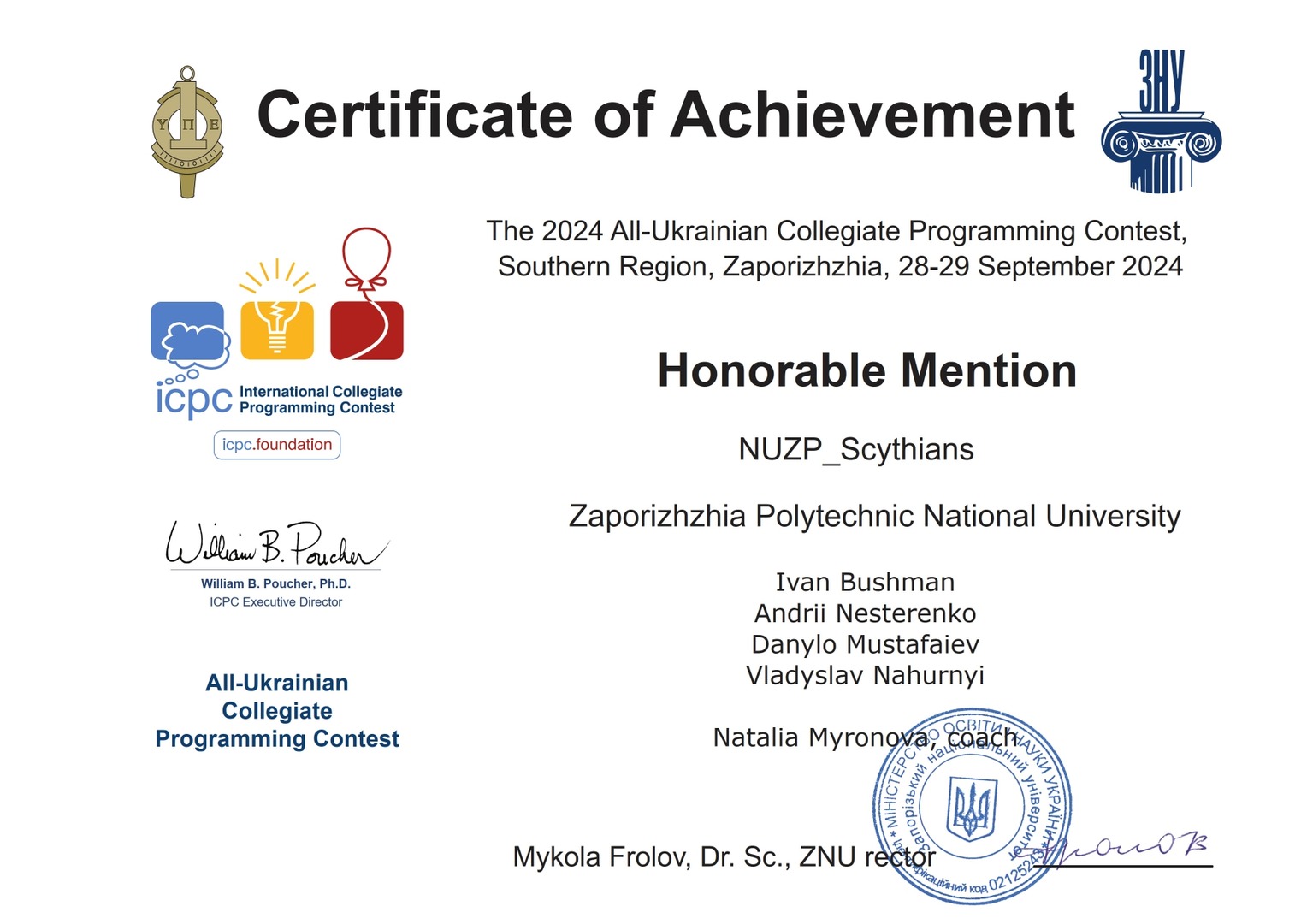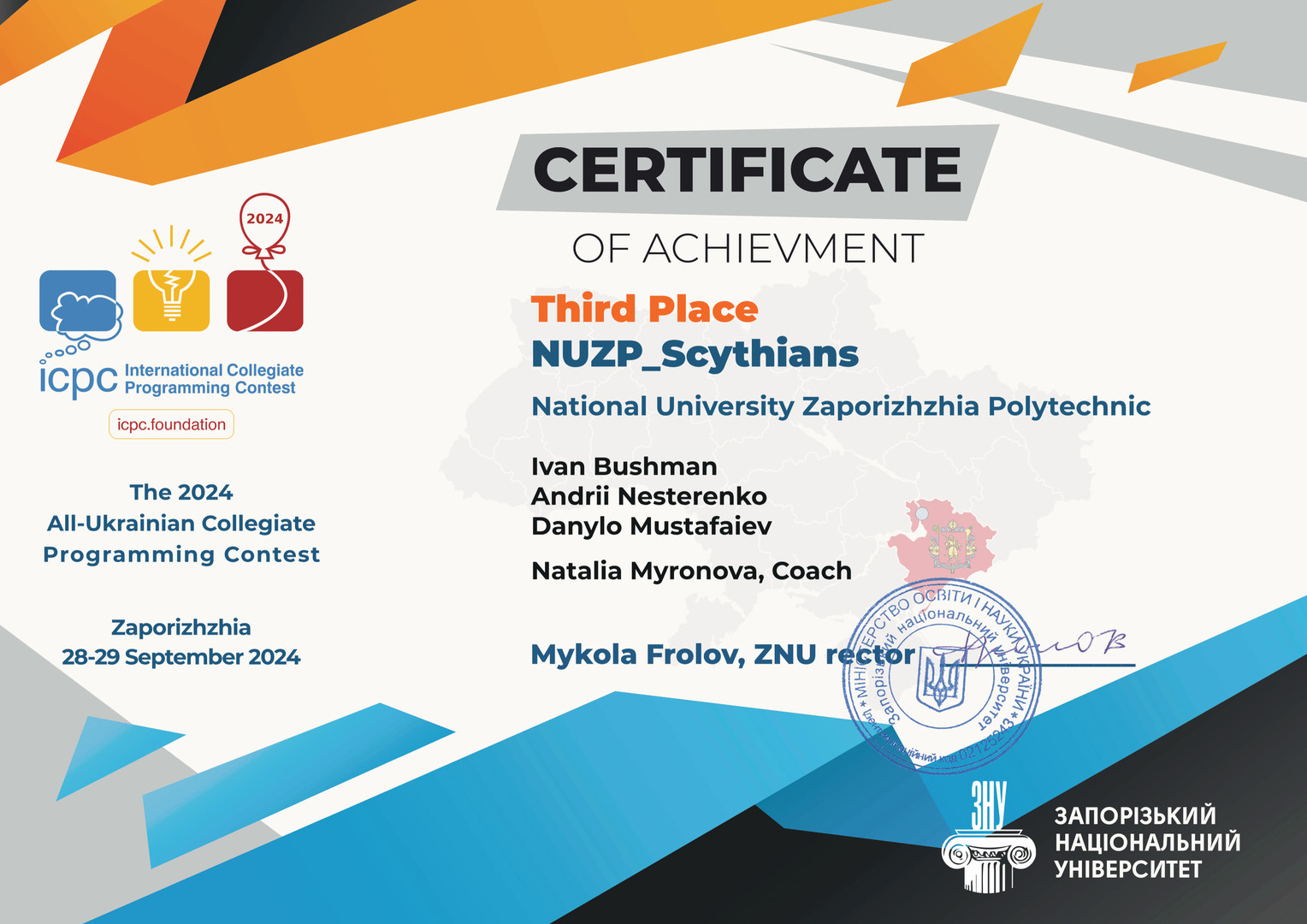 - команда NUZP_Scythians (Іван Бушман, БК-612, Андрій Нестеренко, Данило Мустафаєв, БК-613сп, Владислав Нагурний, БК-613м, тренер — доцентка Наталя Миронова)