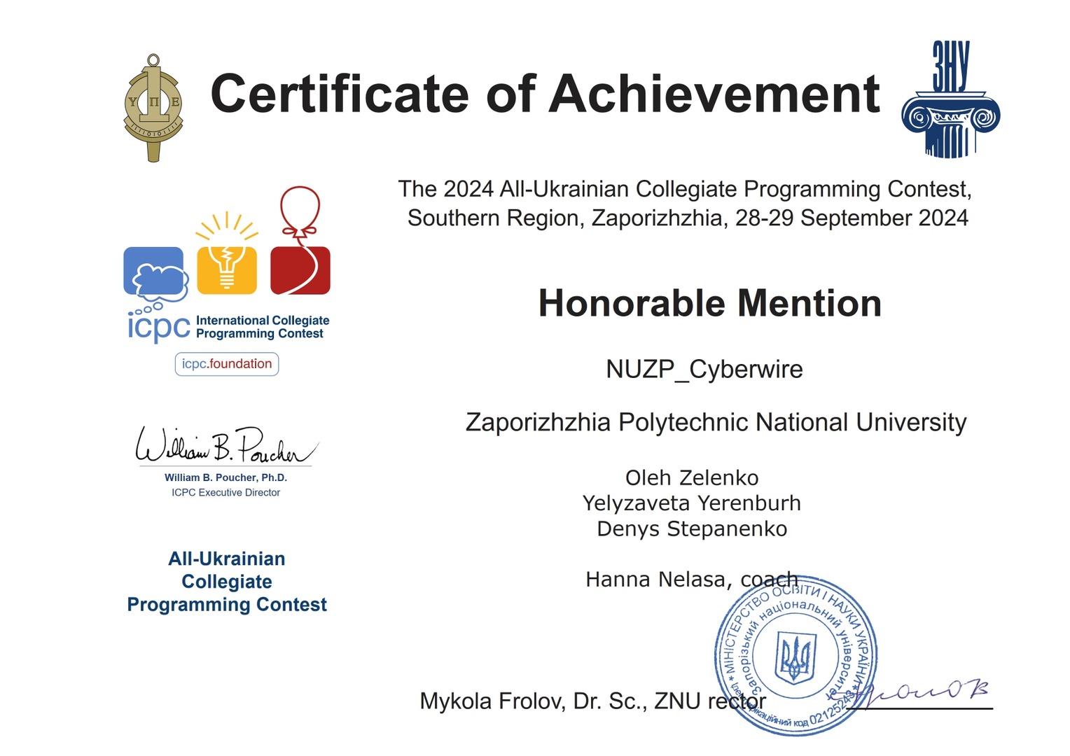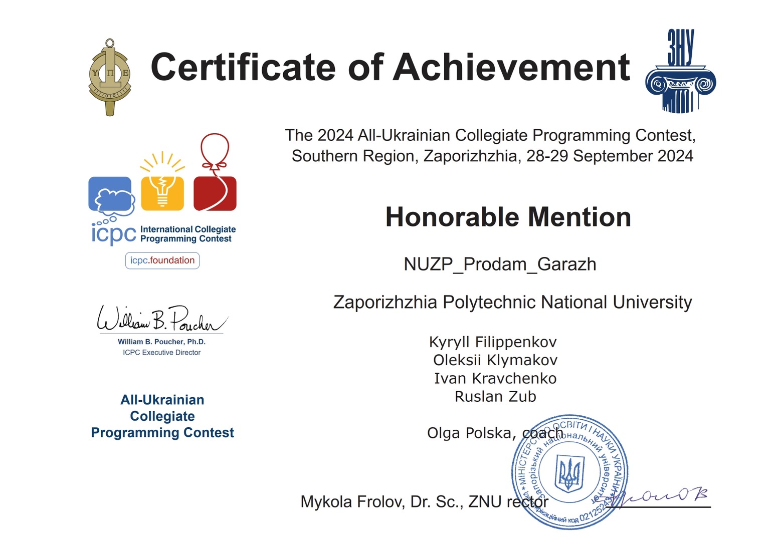 28 вересня у змішаному форматі відбувся I відбірковий етап Всеукраїнської студентської олімпіади з програмування, яка є частиною півфіналу південно-східної Європи Студентської першості світу з програмування (ICPC — SEERC — Ukraine — 2024). Метою змагань є підвищення рівня підготовки майбутніх ІТ-фахівців, підтримка талановитої молоді та розширення міжнародної співпраці.
