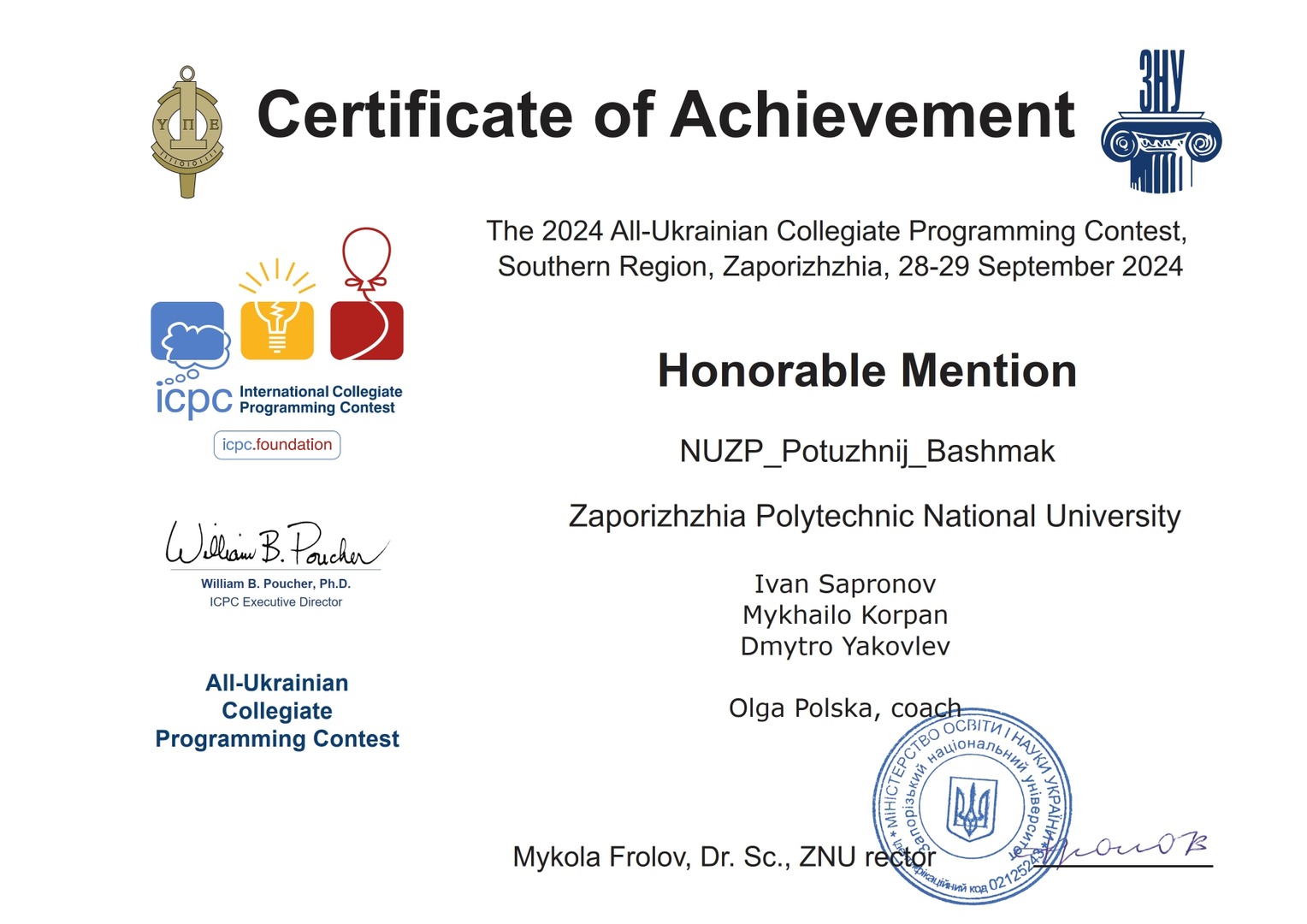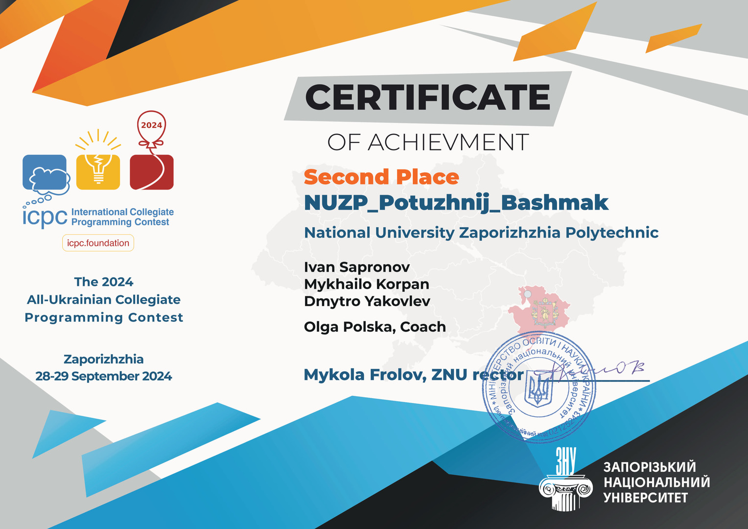 - команда NUZP_Potuzhnij_Bashmak (Іван Сапронов, КНТ-523, Михайло Корпань, КНТ-513, Дмитро Яковлев, КНТ-514сп, тренер — старша викладачка Ольга Польська)
