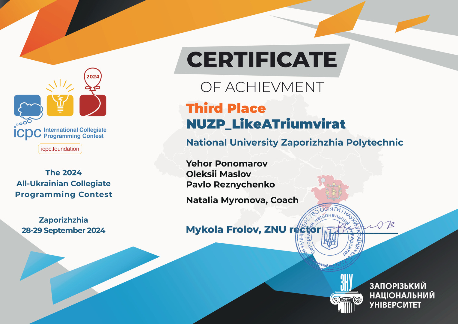 - команда NUZP_LikeATriumvirat (Єгор Пономарьов, Олексій Маслов, Павло Резниченко, БК-611, тренер — доцентка Наталя Миронова)