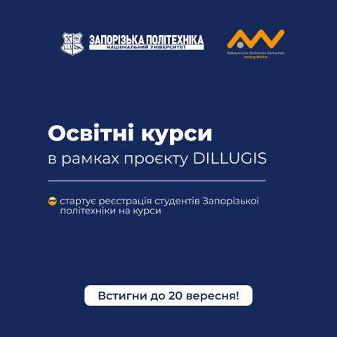 З 7 вересня вже відкритий доступ для запису на курси за проєктом DILLUGIS (Digital Labs & Lectures for Ukrainian, German & International Students). Проєкт передбачає залучення студентів та викладачів НУ «Запорізька політехніка» до цифрового навчання за окремими курсами освітньої програми «Digital Technology and Management» Східно-Баварського університету Амберг-Вайден:
