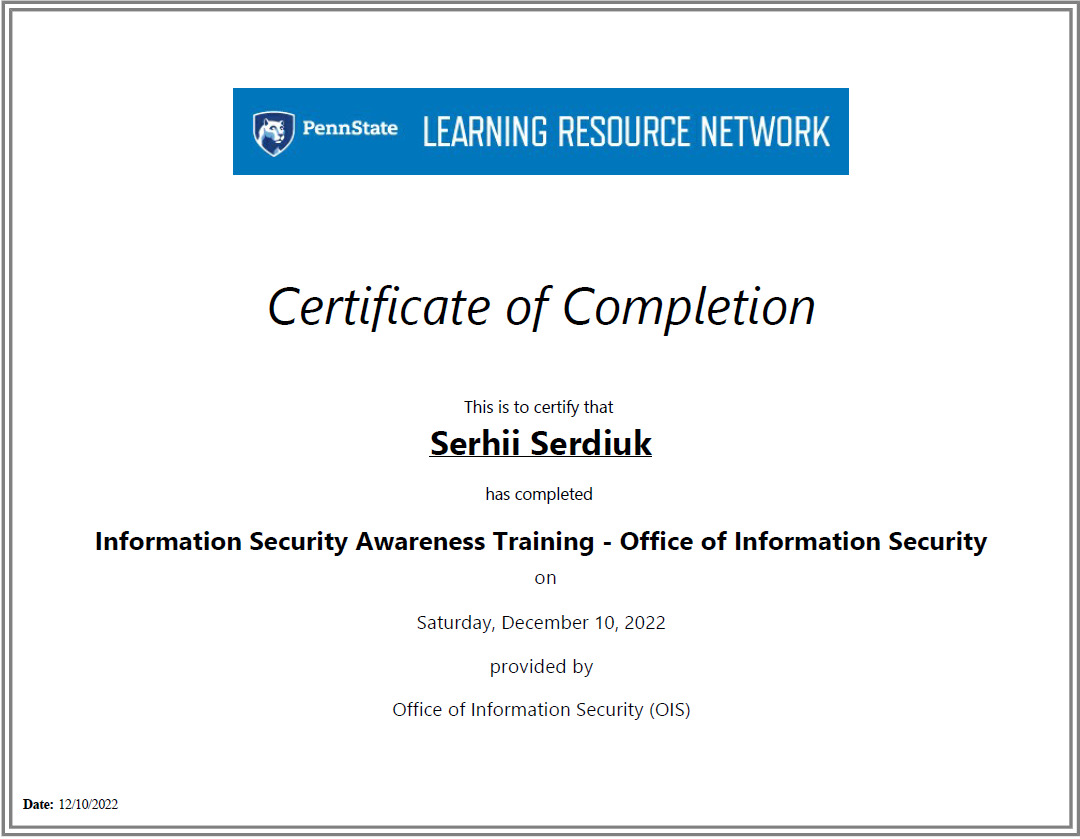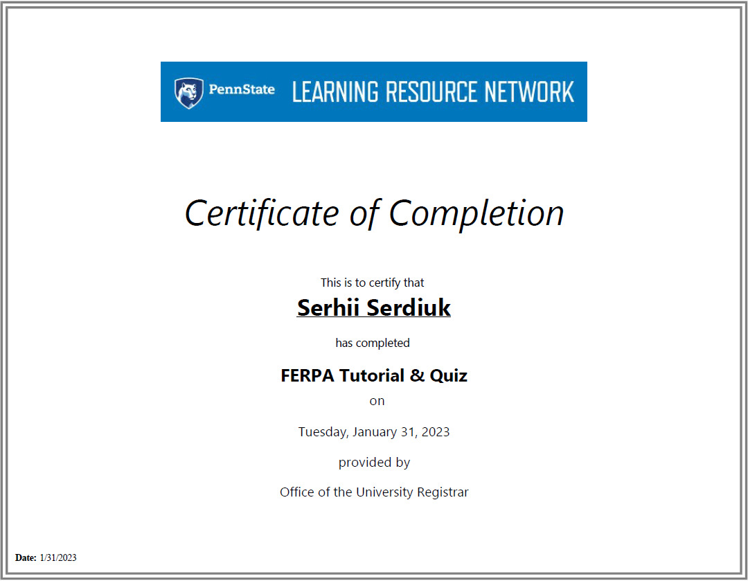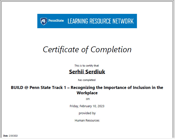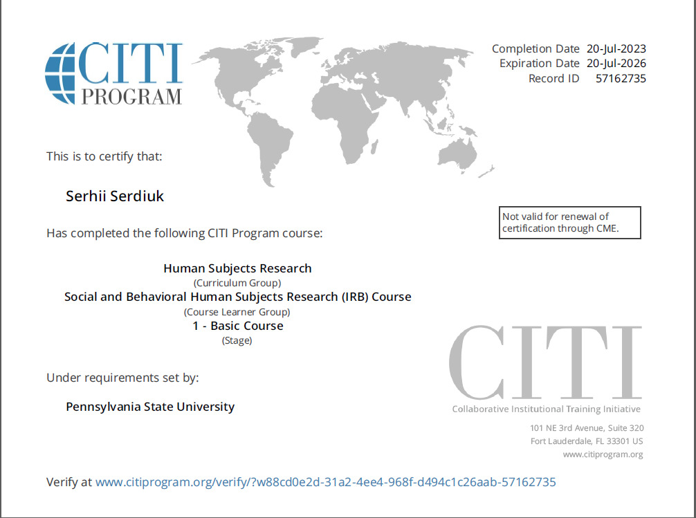 Сергій Сердюк проходив стажування на базі лабораторії прикладних когнітивних наук під керівництвом професора Френка Ріттера, експерта у галузі когнітивного моделювання, когнітивних архітектур, взаємодії людини з комп'ютером. Скориставшись запрошенням пана Ріттера, наш професор брав участь у всіх видах занять з дисциплін «Взаємодія людини й машини» та «Юзабіліті».
