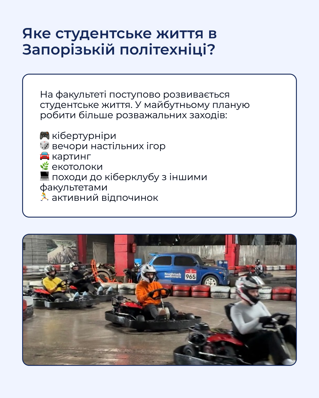 Тож і в години пік встигають на картинг і в кіберклуб разом з іншими факультетами.