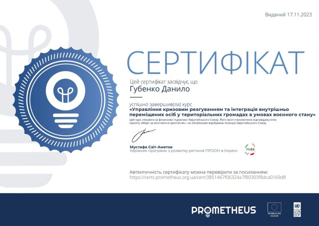 пройшов КУРС "Управління кризовим реагуванням та інтеграція внутрішньо переміщених осіб у територіальних громадах в умовах воєнного стану"