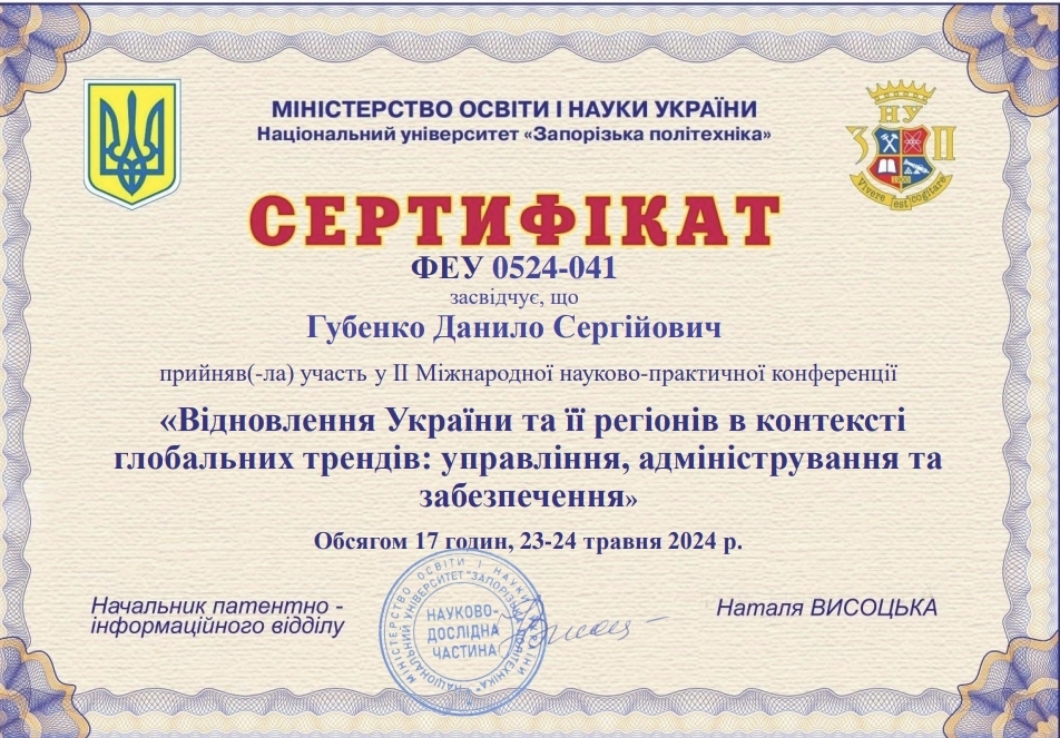 "Відновлення України та її регіонів в контексті глобальних трендів: управління, адміністрування та забезпечення"