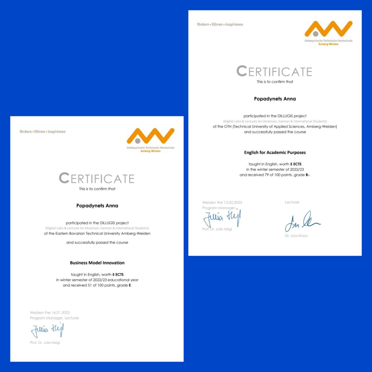 Студентка 3 курсу, групи МТЕ-610, Попадинець Анна, завершила навчання за окремими курсами освітньої програми «Digital Technology and Management» Східно-Баварського університету Амберг-Вайден в рамках реалізації проєкту DILLUGIS (Digital Labs & Lectures for Ukrainian, German & International Students) і одержала сертифікат міжнародної академічної мобільності.