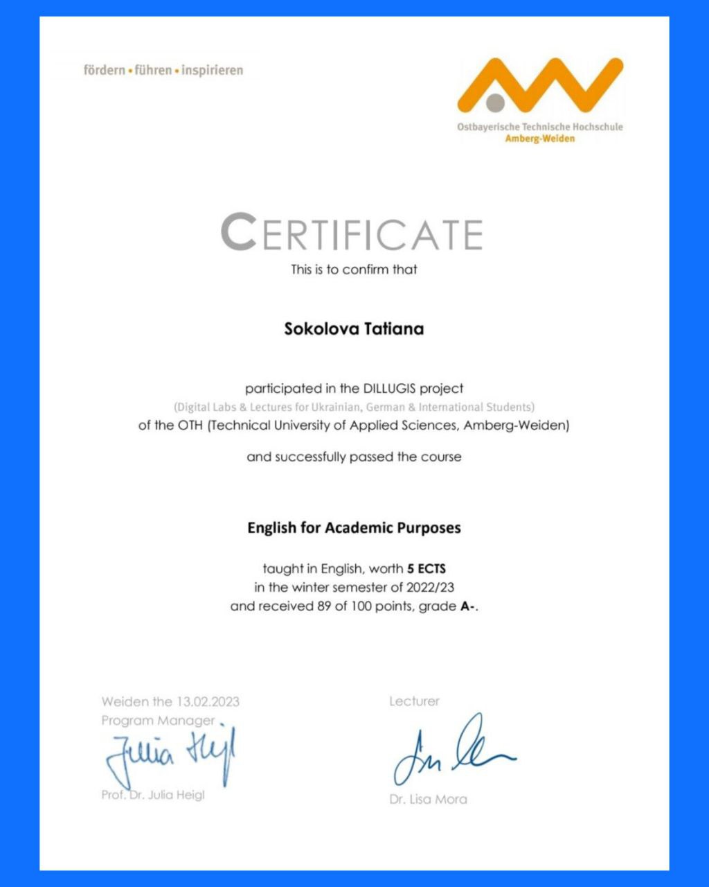 Студентка 2 курсу, групи МТЕз-211, Соколова Тетяна Андріївна, завершила навчання за окремими курсами освітньої програми «Digital Technology and Management» Східно-Баварського університету Амберг-Вайден в рамках реалізації проєкту DILLUGIS (Digital Labs & Lectures for Ukrainian, German & International Students) і одержала сертифікат міжнародної академічної мобільності.