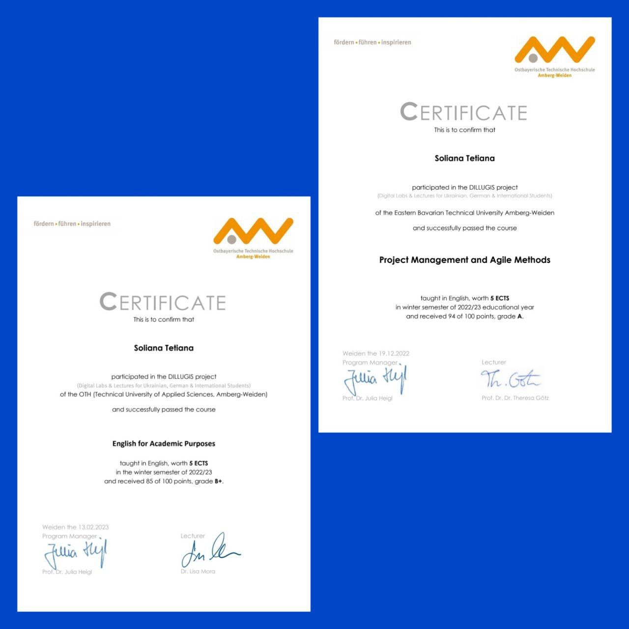 Студентка 3 курсу, групи МТЕ-210, Соляна Тетяна Миколаївна, завершила навчання за окремими курсами освітньої програми «Digital Technology and Management» Східно-Баварського університету Амберг-Вайден в рамках реалізації проєкту DILLUGIS (Digital Labs & Lectures for Ukrainian, German & International Students) і одержала сертифікат міжнародної академічної мобільності.