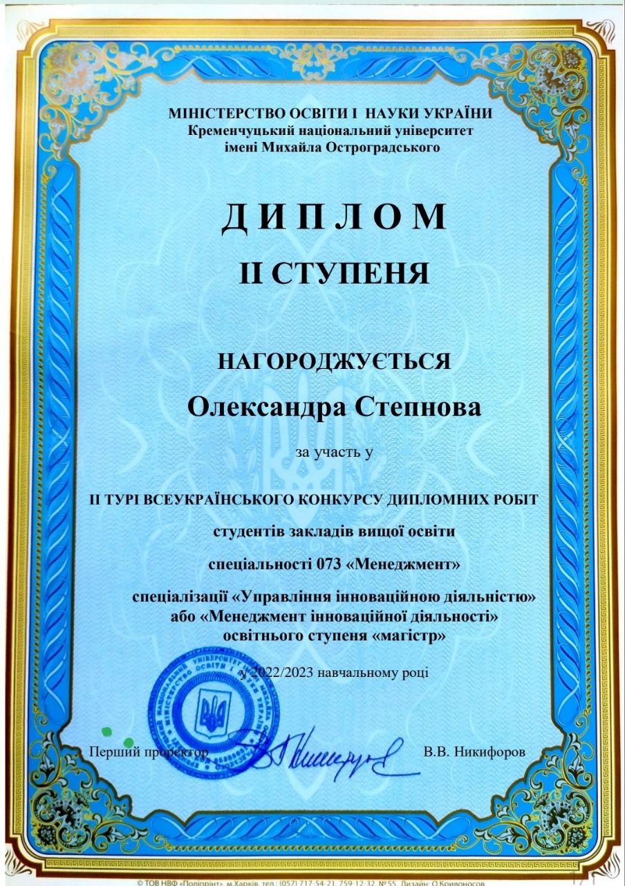стала призером Всеукраїнського конкурса дипломних робіт студентів закладів вищої освіти з темою "Управління інноваційним розвитком персоналу підприємства"