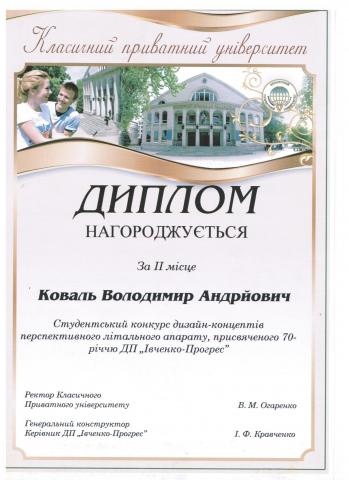 У травні цього року на базі Класичного приватного університету пройшов конкурс студентських дизайн-проектів пов'язаних з літальною тематикою. Організаторами виступили ДП «Івченко-Прогрес» спільно с Класичним приватним університетом. І присвячений він був 70-річчю легендарного конструкторського бюро, де було створено немало передових авіаційних двигунів. У конкурсі взяла участь велика кількість студентів з різних міст і навчальних закладів, що надало йому статус всеукраїнського. Серед членів журі були викладачі Класичного приватного університету, а також провідні конструктори ДП «Івченко-Прогрес», зокрема і генеральний конструктор, керівник КБ Кравченко Ігор Федорович.