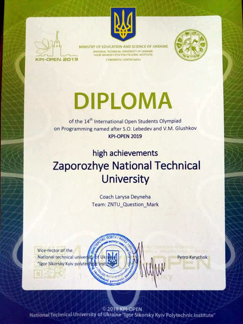 1-5 липня 2019 року в Національному технічному університеті України «Київський політехнічний інститут імені Ігоря Сікорського» проводилась Чотирнадцята міжнародна студентська олімпіада з програмування імені С.О.Лебедєва та В.М.Глушкова «KPI-OPEN 2019». В ній взяли участь 2 команди НУ "Запорізька політехніка", до складу яких входять студенти 2 курсу кафедри програмних засобів факультету КНТ: Question_Mark (Басанець М.І., Камєнський Д.В., Діденко А.Є.) та CoRe (Козлов В.В., Бережний О.Ю., Судаков В.Р.), під керівництвом старшого викладача кафедри програмних засобів Дейнеги Л.Ю.