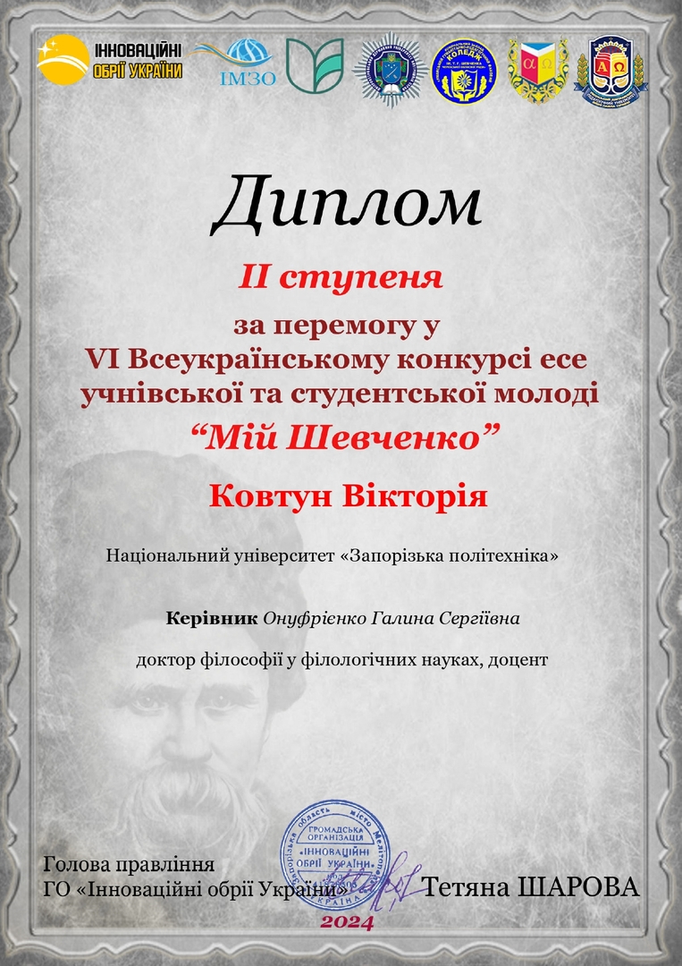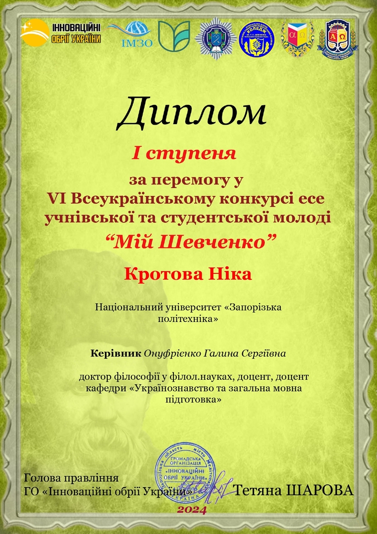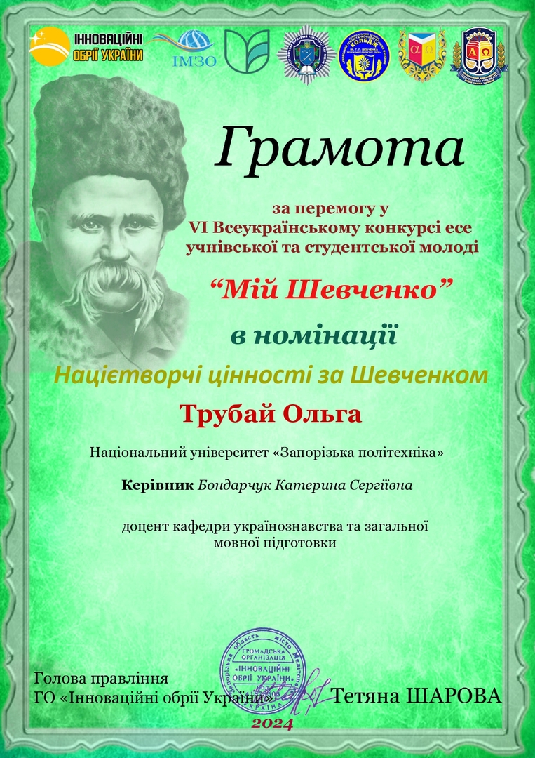 Перше та друге місця вибороли під науковим керівництвом доцентки кафедри українознавства та загальної мовної підготовки Галини Онуфрієнко студентки ФБАД: першокурсниця Ніка Кротова (БАД-513) — 1 місце, другокурсниця Вікторія Ковтун (БАД-532) — 2 місце. Їх нагороджено дипломами відповідно 1 і 2 ступеня. Есе переможців будуть опубліковані в збірці «Мій Шевченко».