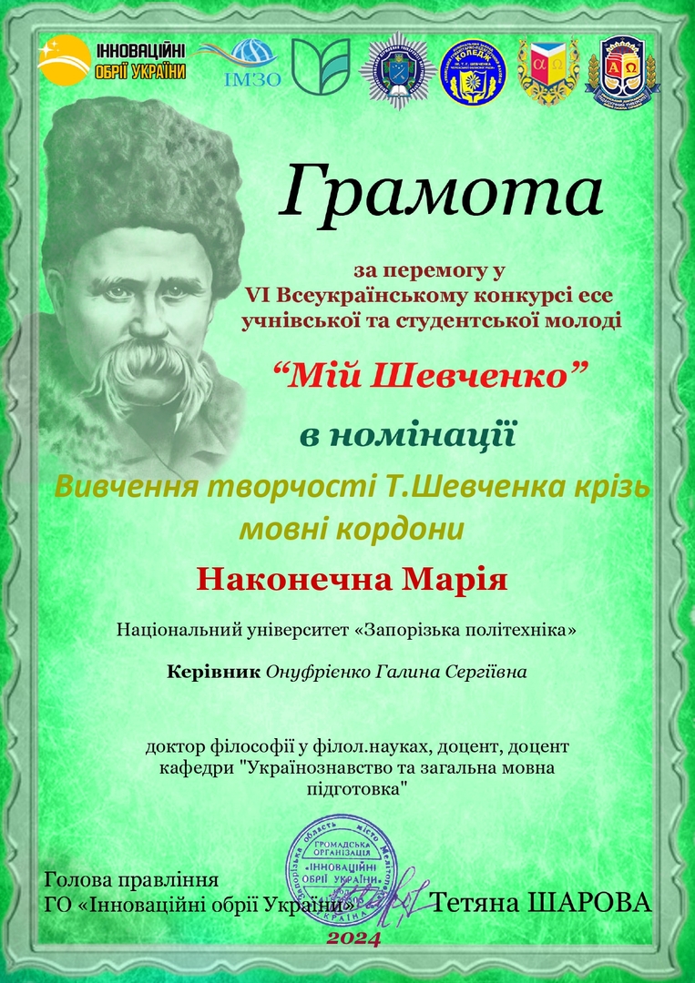 В актуальній номінації «Творчість Шевченка крізь мовні кордони» перемогла першокурсниця з групи ГФ-313 Марія Наконечна (наукова керівниця — Галина Онуфрієнко), а студентка Ольга Трубай (наукова керівниця — Катерина Бондарчук) — у номінації «Націєтворчі цінності за Шевченком».