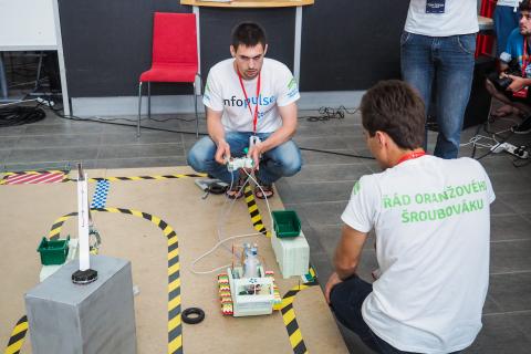 Перше завдання полягало в тому, щоб створити автомобіль, здатний піднімати 3 коробки з полки, переміщати їх на іншу полицю, при цьому проходячи через смугу перешкод, хитромудрій траєкторії. На виконання завдання учасникам було дано два дні. Завдання запропонував партнер заходу – Skoda Auto.
