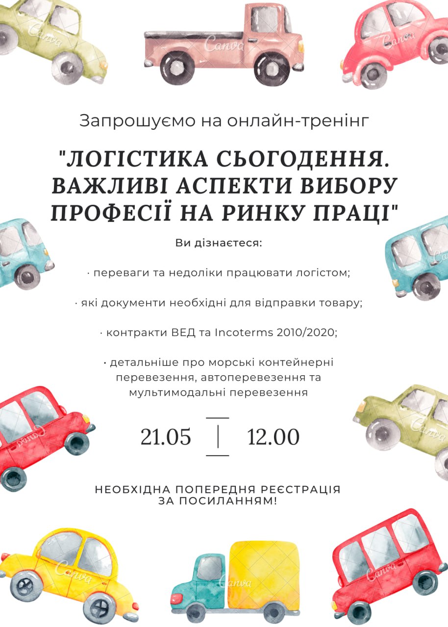 Шановні студенти та усі зацікавлені особи! Запрошуємо взяти участь у онлайн-тренінгу "Логістика сьогодення. Важливі аспекти вибору професії на ринку праці", який проводитиметься за ініціативи студентства транспортного факультету.