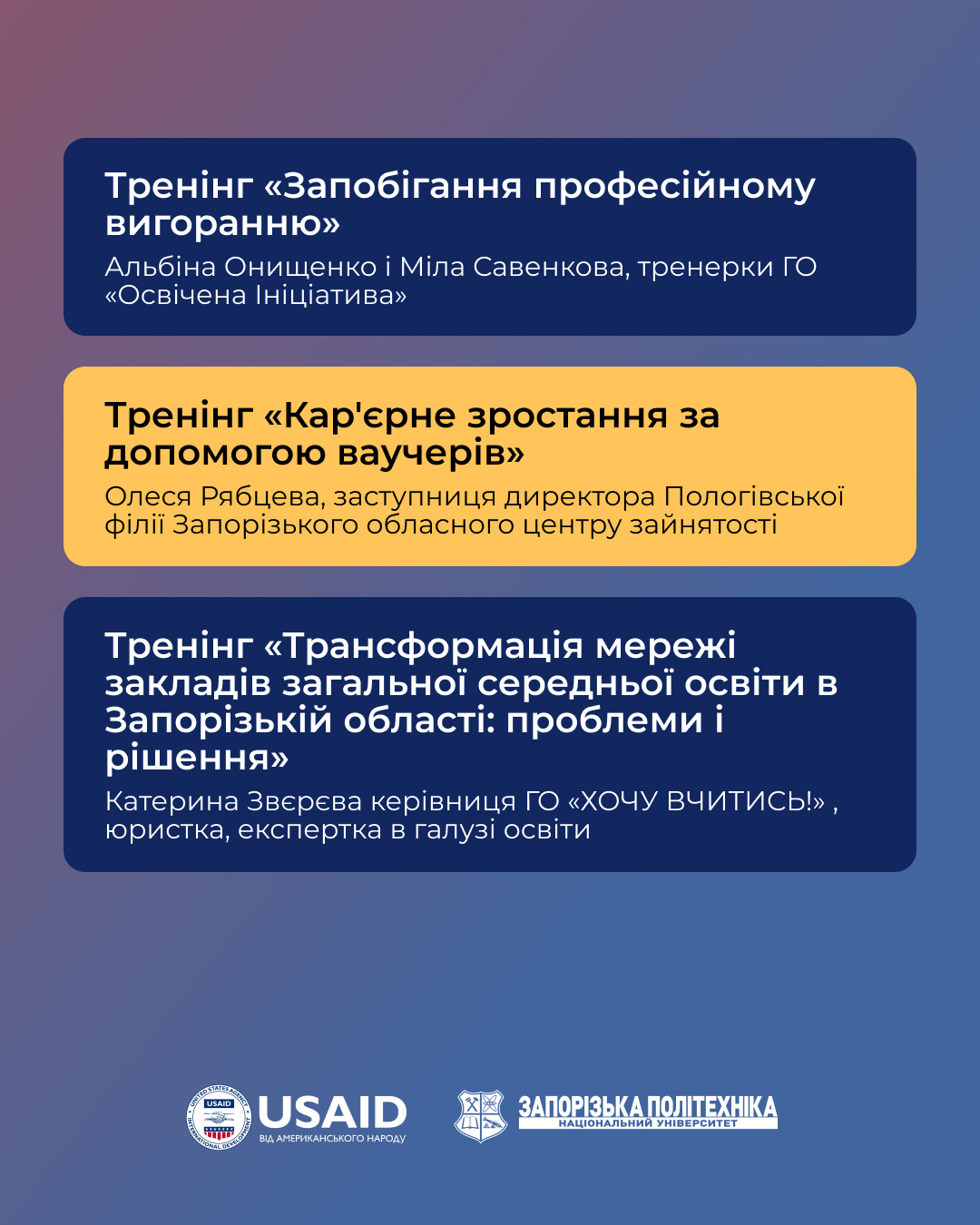 Cтворення освітнього хабу для переміщених вчителів у Національному університеті «Запорізька політехніка» стало можливим за підтримки проєкту Агентства США з міжнародного розвитку USAID «Зміцнення громадської довіри» (UCBI) (USAIDUkraine, UkraineConfidenceBuildingInitiative).
