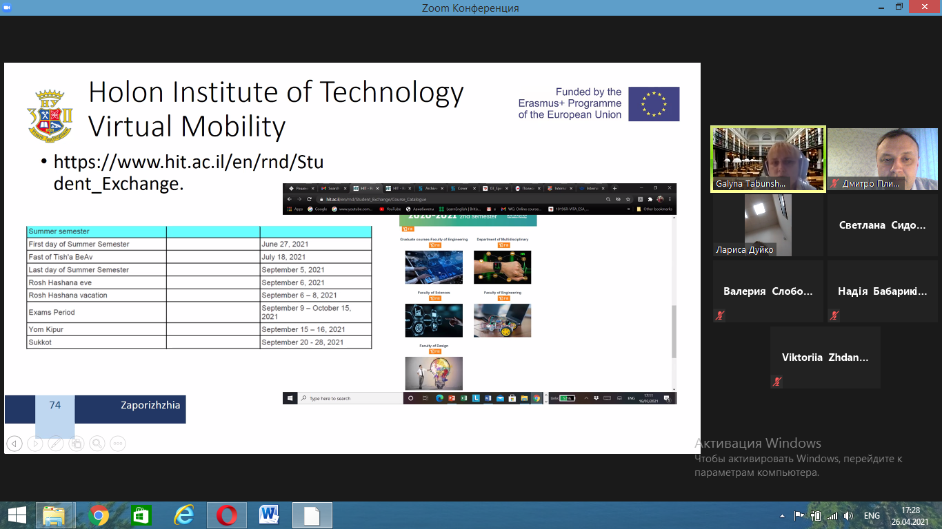 У breakout room від НУ «Запорізька політехніка» з презентацією виступила проф. кафедри ПЗ Галина Табунщик. Вона розповіла про існуючі можливості для студентів Запорізької політехніки взяти участь у програмі академічної мобільності, зокрема про наших міжнародних партнерів та досвід участі студентів та викладачів університету в програмі академічної мобільності.