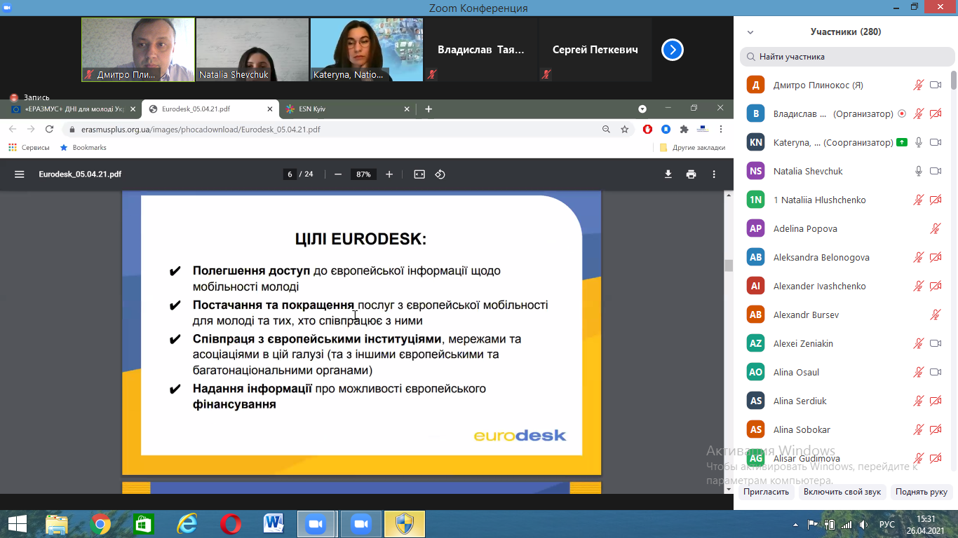Команда Національного Еразмус+ офісу в Україні (Проєкт ЄС) спільно з Erasmus Student Network Kyiv 26 квітня 2021 р. провели «ЕРАЗМУС+ ДНІ для молоді України: Zoom edition – SOUTH-EAST» щодо можливостей навчання і практики, викладання та стажування в провідних європейських університетах, молодіжних обмінів та волонтерства в межах Програми Європейського Союзу Еразмус+. Захід відбувся за підтримки Представництва ЄС в Україні у співпраці з Міністерством освіти і науки України, Міністерством молоді та спорту України, Євродеск Україна, Інформаційним центром Еразмус+ молодь та Європейський корпус солідарності, закладами вищої освіти, студентами-учасниками обмінів Еразмус+ та випускниками Еразмус Мундус.