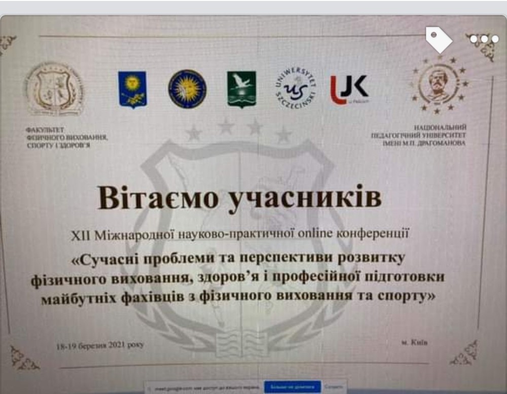 Викладачі нашої кафедри прийняли участь у XIІ Міжнародній науково-практичній конференції «Сучасні проблеми та перспективи розвитку фізичного виховання здоров'я і професійної підготовки майбутніх фахівців з фізичного виховання та спорту», яка відбулася 18-19 березня 2021 року у режимі online. У роботі конференції взяли участь науковці з ЗВО міст Мінськ, Гомель, Пінськ (Білорусь), Kielce, Щецин (Польща), Київ та Запоріжжя (Україна).