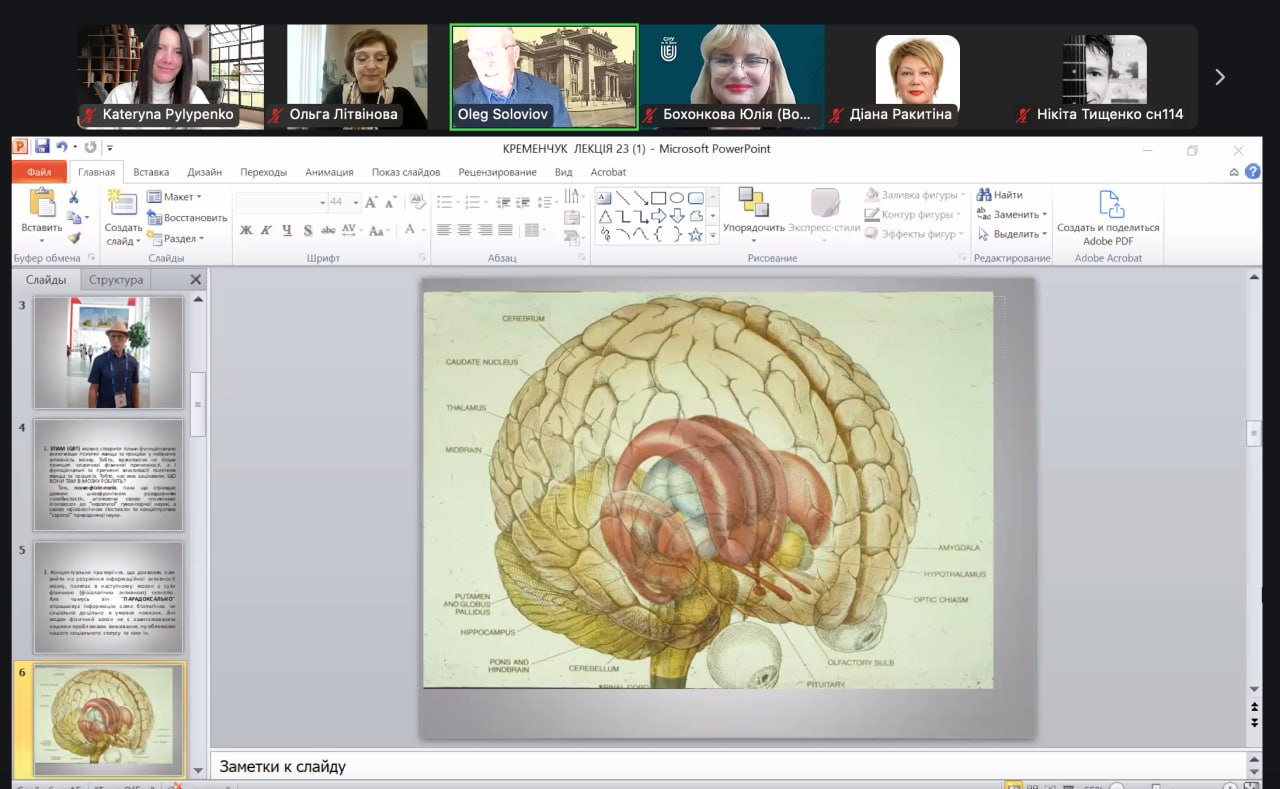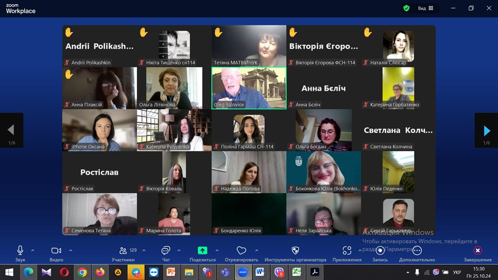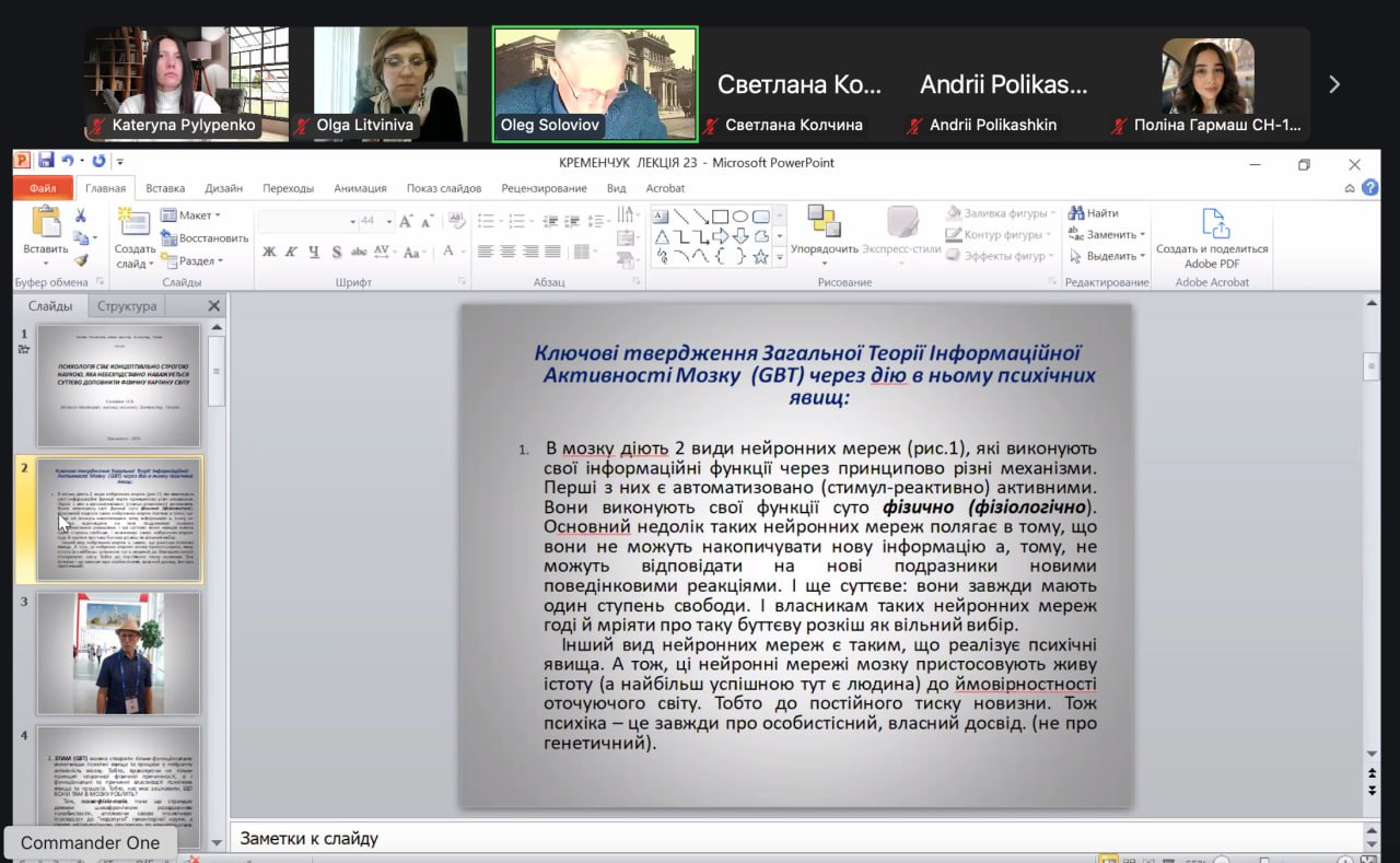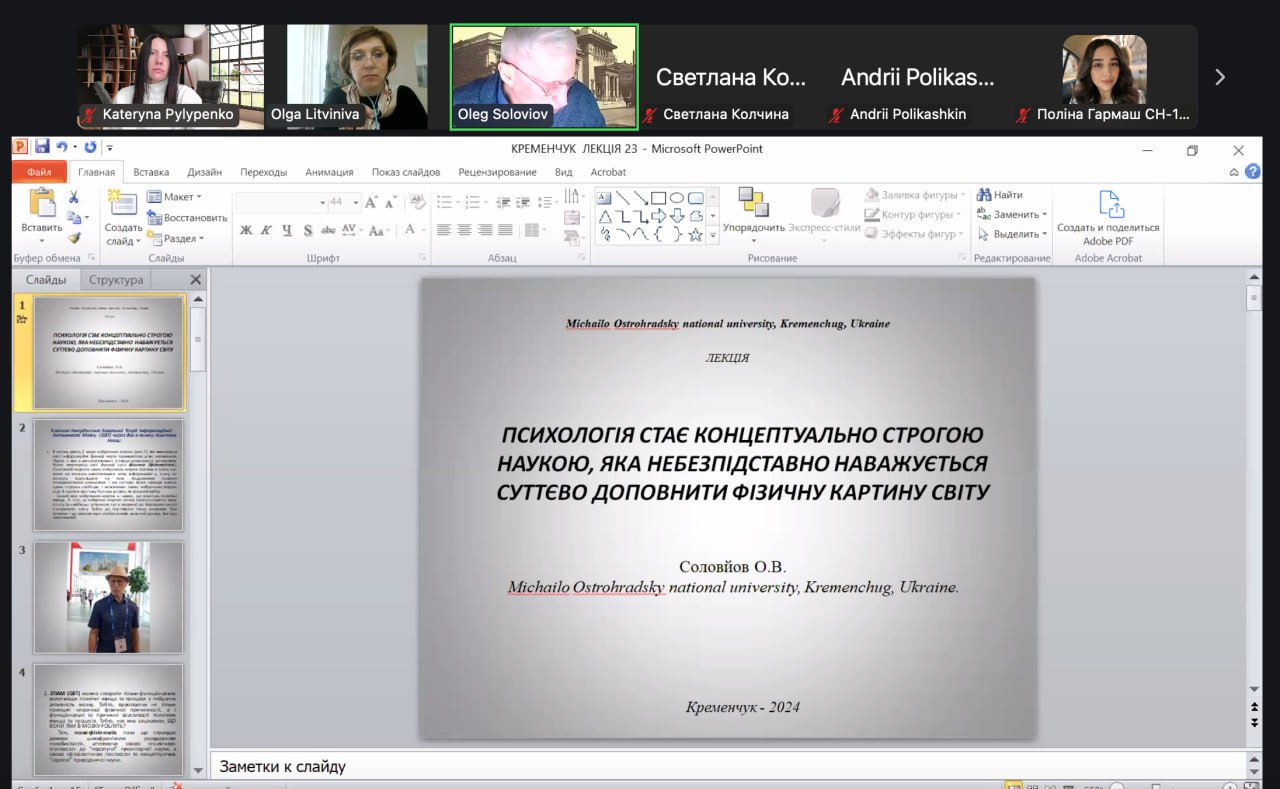 25 жовтня доцентка кафедри психології Катерина Пилипенко разом з нашими першокурсниками в межах вивчення ОК «Загальна психологія» і «Психофізіологія» взяли участь в лекції Олега Соловйова — доктора психологічних наук, професора, професора кафедри психології, педагогіки та філософії Кременчуцького національного університету імені Михайла Остроградського, яка була присвячена темі «Психологія стає концептуально строгою наукою, яка небезпідставно наважується суттєво доповнити фізичну картину світу».