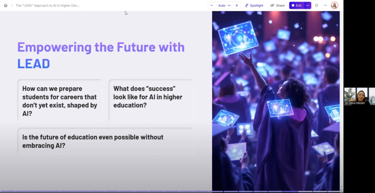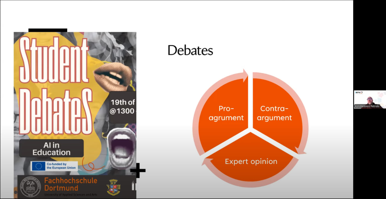 З презентацією, яка окреслила проблематику питання використання штучного інтелекту в освіті і його етичний аспект, перед учасниками виступила доктор Олена Мізрахі (Elena Mizrahi) з Західногалілейського коледжу (Ізраїль). Надалі студенти, поділені на дві змішані інтернаціональні групи, обговорювали аргументи «за» та «проти» використання штучного інтелекту в освіті та за підсумками обговорення виступили з ними у форматі дебатів, обґрунтовуючи свою думку та висуваючи контраргументи у відповідь на аргументи представників команди-опонента. Команда експертів оцінювала виступи учасників та коректність їх тверджень. Усі учасники, які взяли участь у дебатах, отримають сертифікати участі у програмі віртуальної мобільності.