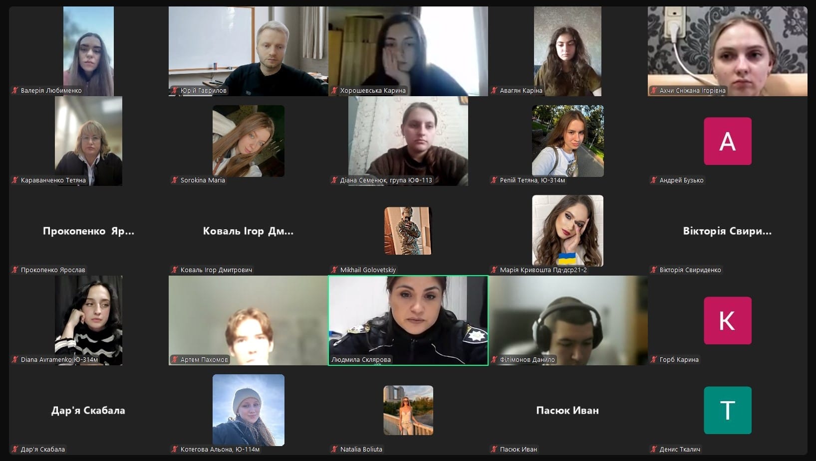 19 листопада 2024 року Гавриловим Юрієм Геннадійовичем, к.ю.н., доцентом кафедри конституційного, адміністративного та трудового права була організована онлайн-зустріч студентів Юридичного факультету НУ "Запорізька політехніка" з Людмилою Скляровою - старшим інспектором Департаменту головної інспекції та дотримання прав людини Національної поліції України.
