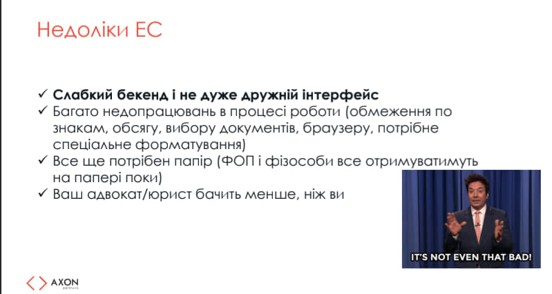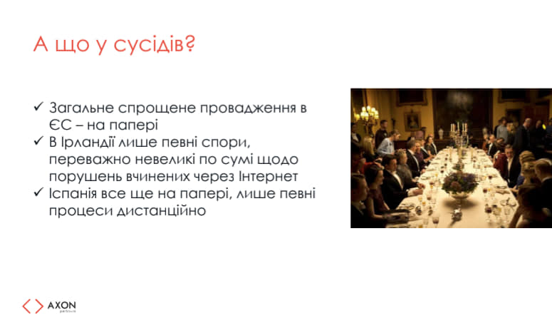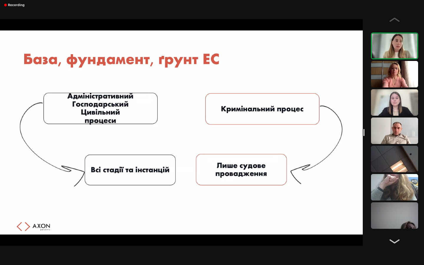 Спікерами заходу виступили Я.Бакаленко — соо компанії AXON partners та Н.Деисюк — партнерка компанії AXON partners. Модератор А.Барабанова — юрист, експерт із питань електронного документообігу IntecracyDeals.