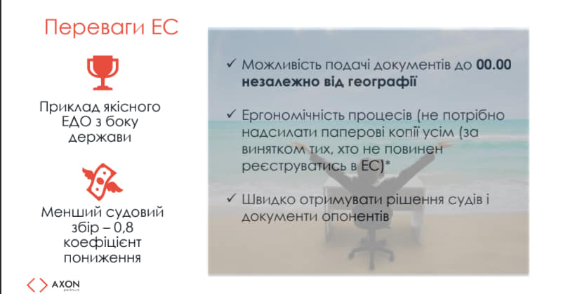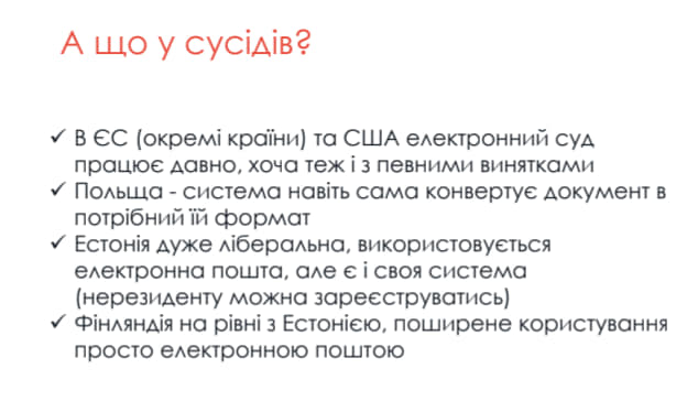 Обговорювали питання функціонування Єдиної судової інформаційно-телекомунікаційної системи, порядку реєстрації в електронному суді (ЕС), його перевагах та недоліках, обговорювали зарубіжний досвід функціонування ЕС та багато технічних моментів його роботи, а також поради щодо застосування та організації роботи з системою від експертів.