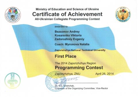 26 квітня 2014 року у Запорізькому національному університеті відбувся I етап Всеукраїнської студентської олімпіади з програмування ACM (обласний). I етап олімпіади одночасно є 1/8 фіналу Міжнародної студентської олімпіади з програмування ACM.