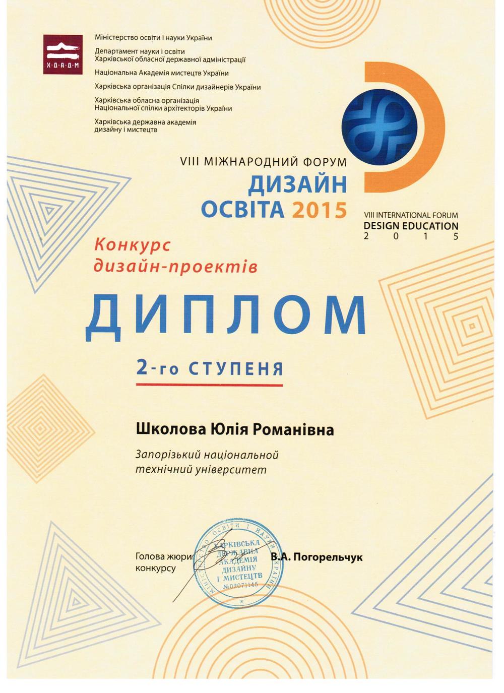 Школова Юлія Романівна, студентка групи ГФ-922і – Диплом ІI ступеня у конкурсі дизайн-проектів