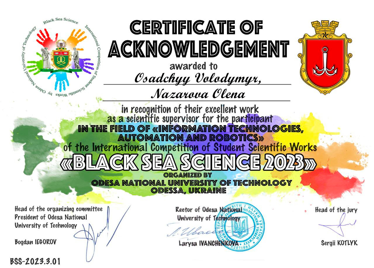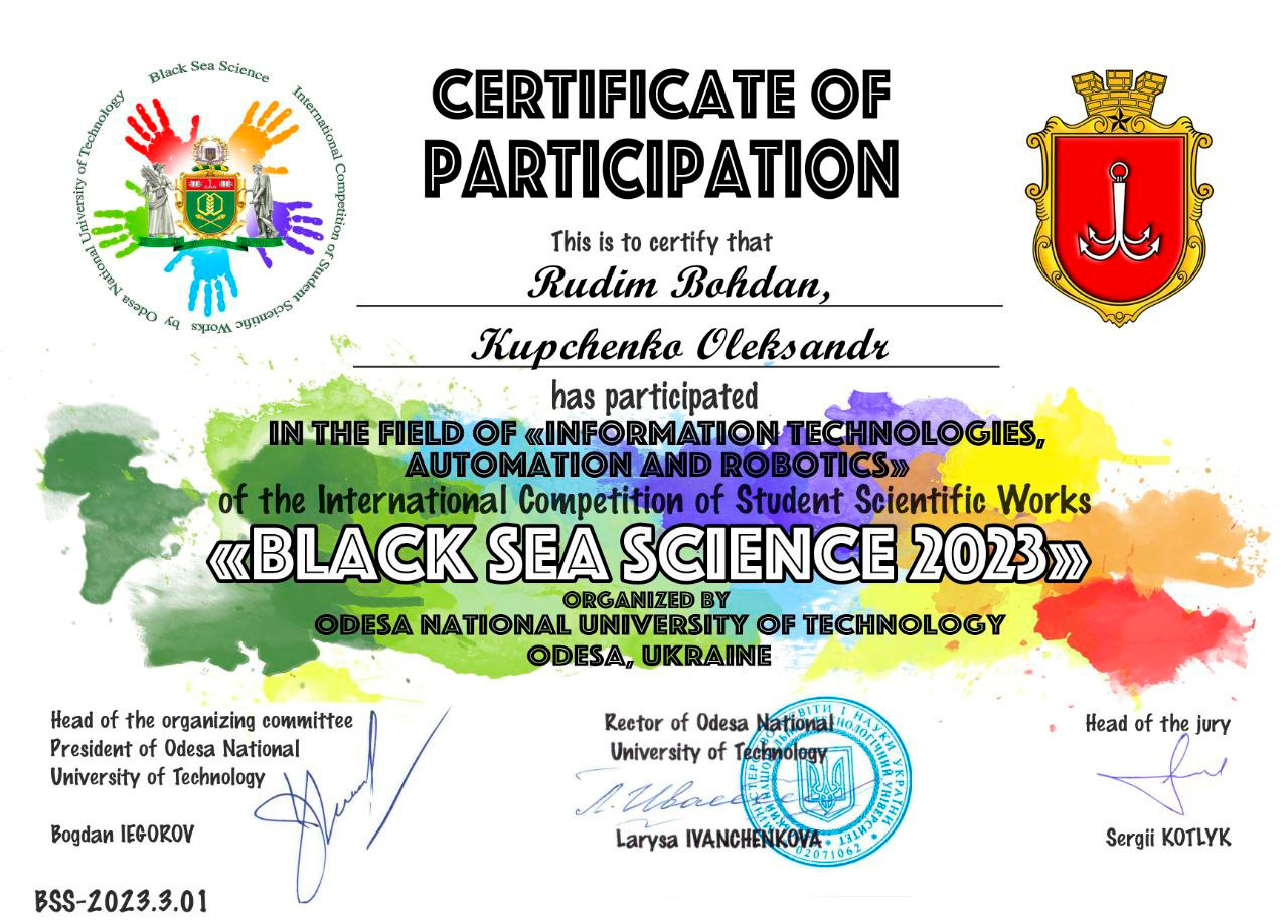 Студенти електротехнічного факультету Богдан Рудім та Олександр Купченко взяли участь у Міжнародному конкурсі студентських наукових робіт «Black Sea Science»-2023, на якому представили власні наукові дослідження за напрямом «Інформаційні технології, автоматизація, робототехніка». За підсумками рецензування робота студентів Запорізької політехніки отримала гідні 72,5 бали серед інших учасників з України, Німеччини, Оману, Алжиру, Литви, Індії, Сербії, Хорватії, Пакистану, Польщі, Грузії, Казахстану, Болгарії та Молдови.