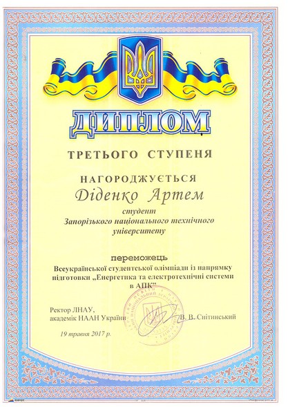 Вітаємо з бронзовою нагородою Артема Діденко у ІІ етапі Всеукраїнської студентської олімпіади з напряму «Енергетика та електротехнічні системи в АПК».