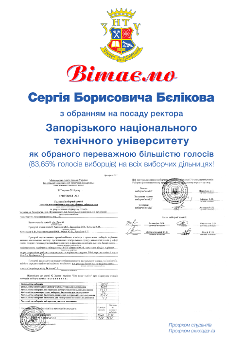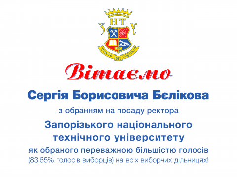 Вітаємо Сергія Борисовича Бєлікова з обранням на посаду ректора Запорізького національного технічного університету як обраного переважною більшістю голосів (83,65% голосів виборців) на всіх виборчих дільницях!