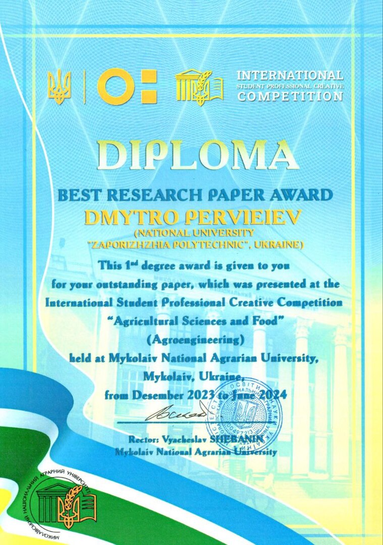 Національний університет «Запорізька політехніка» на міжнародному рівні за напрямом «Агроінженерія» представив студент Дмитро Первєєв під науковим керівництвом завідувача кафедри металорізальних верстатів та інструментів Михайла Фролова та професора кафедри Володимира Циганова.