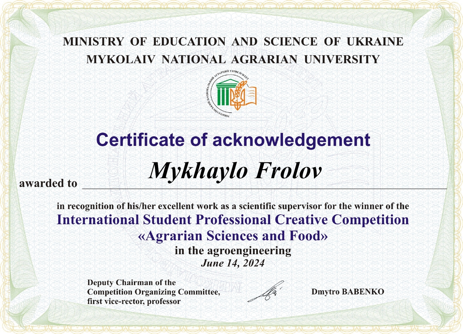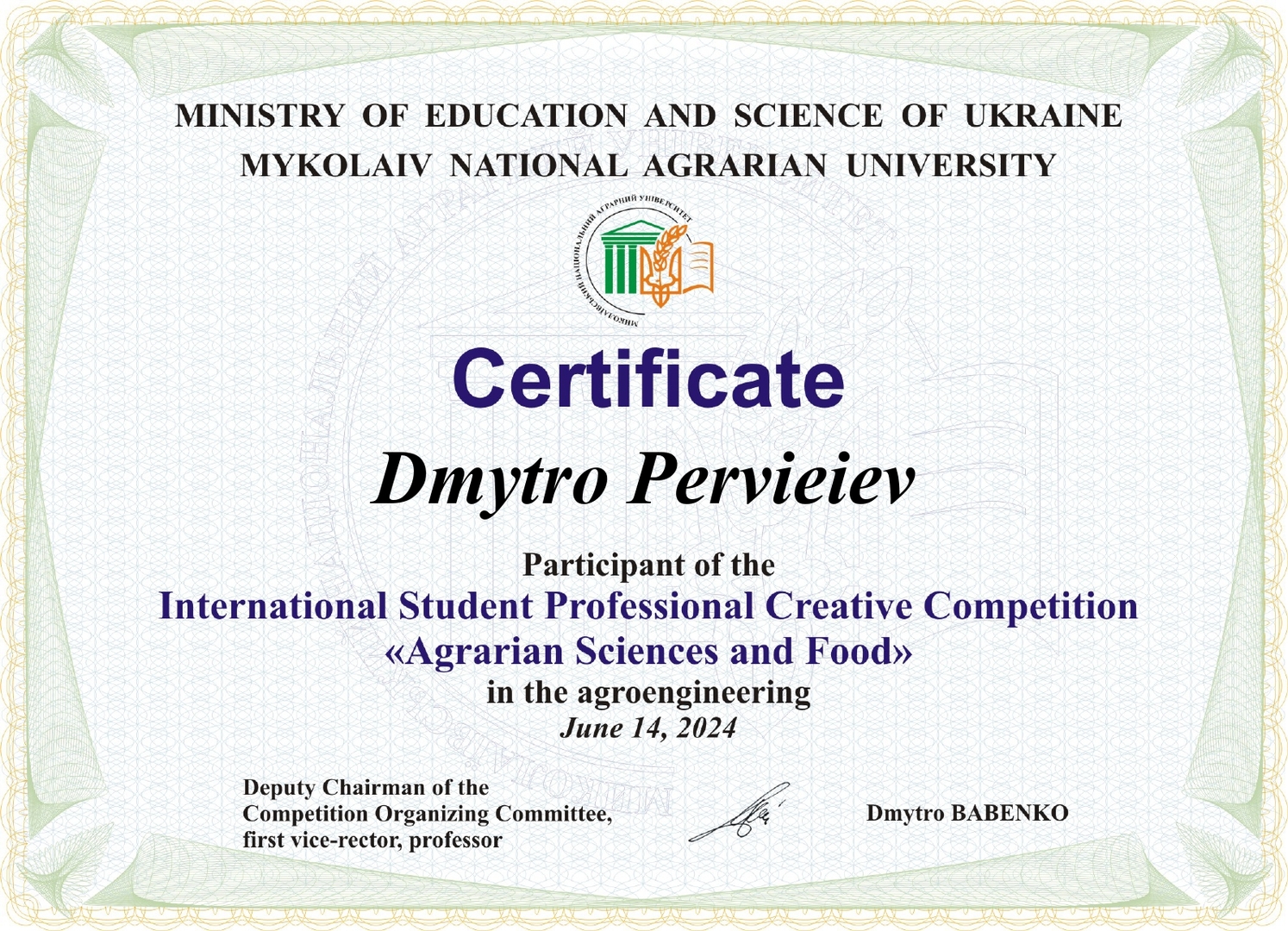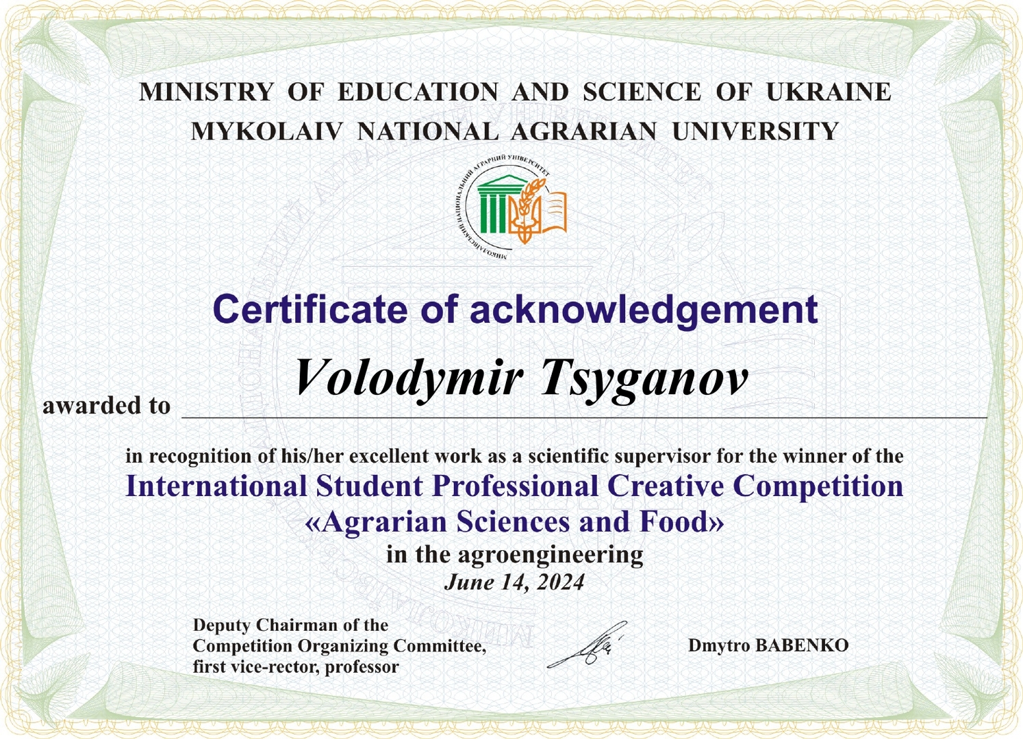 У грудні 2023 – червні 2024 років на базі Миколаївського національного аграрного університету відбувся Міжнародний студентський професійний творчий конкурс «Аграрні науки та продовольство».