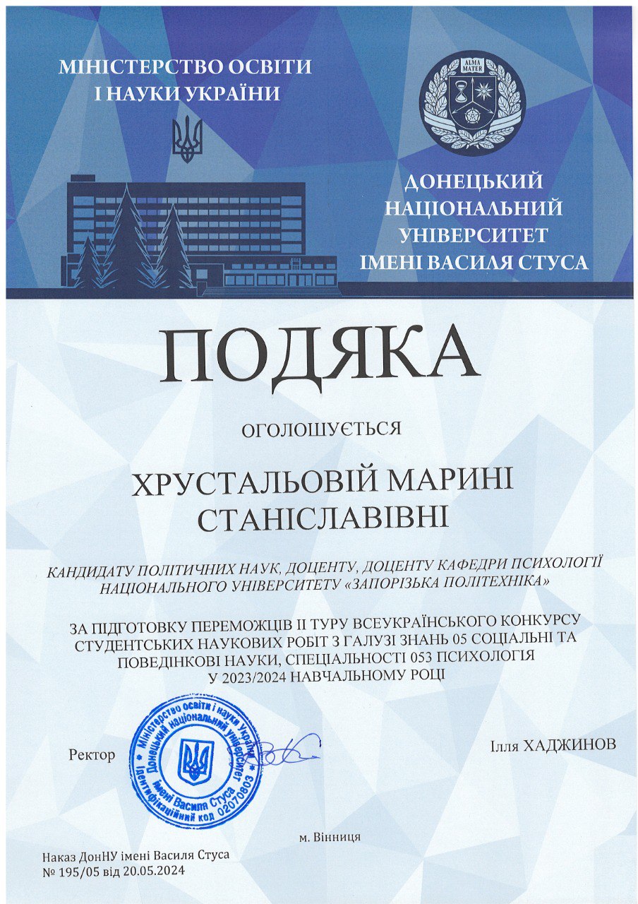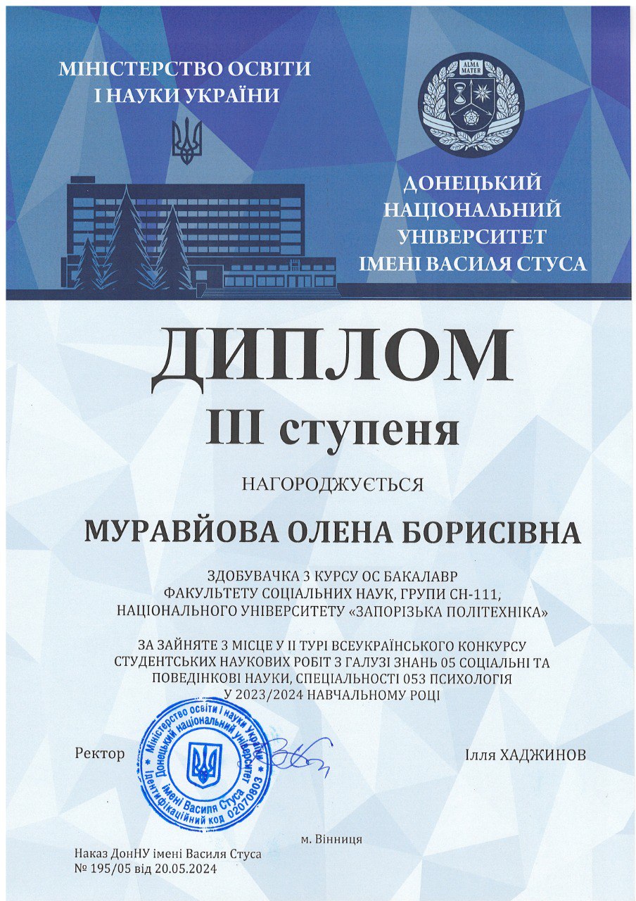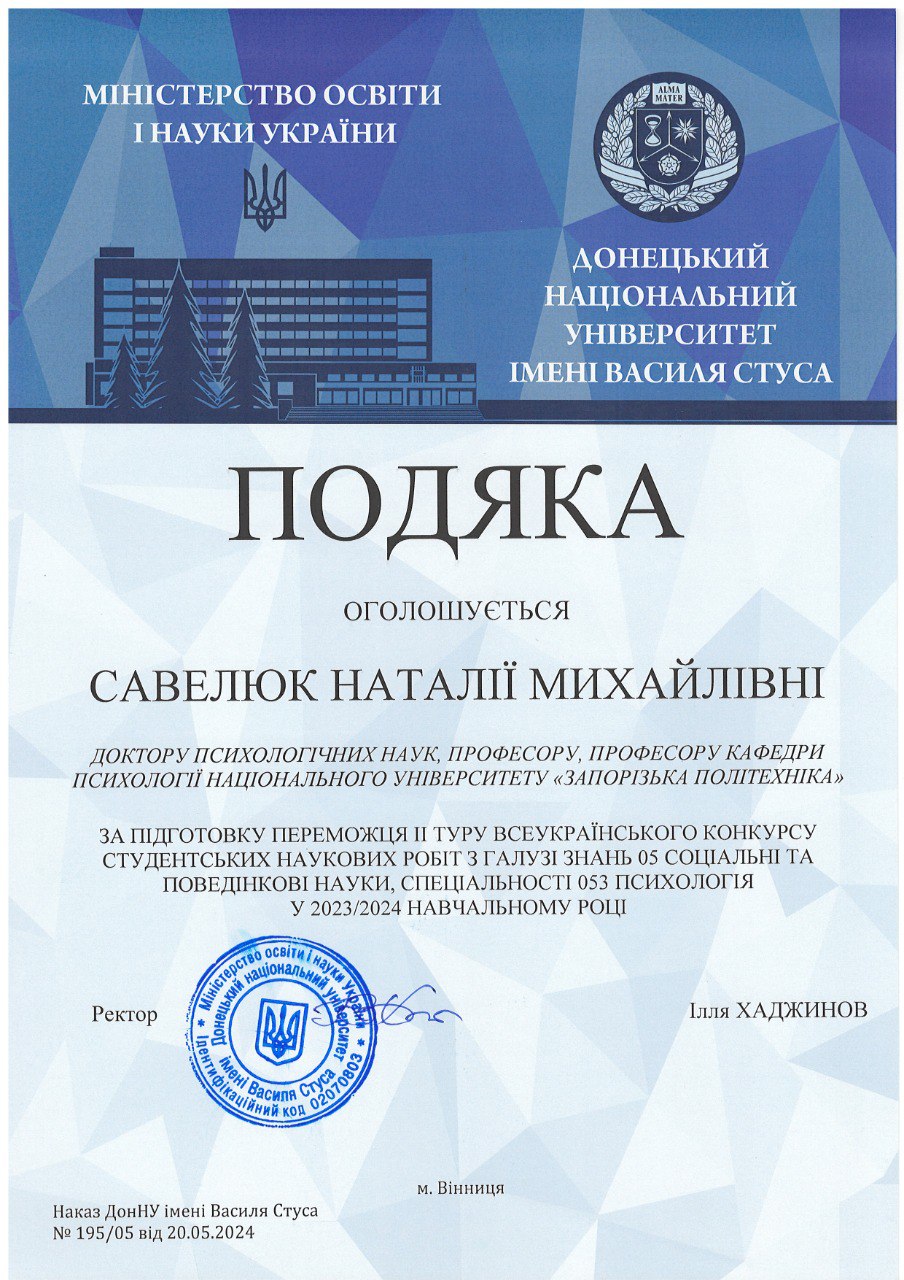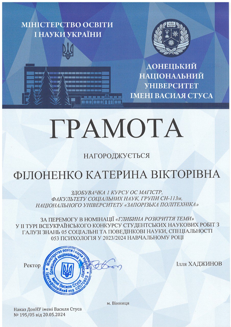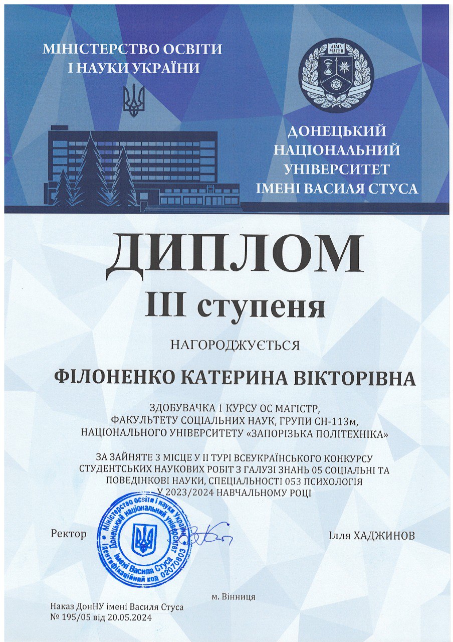 Студенти Національного університету «Запорізька політехніка» взяли участь у Всеукраїнському конкурсі студентських наукових робіт з психології, який відбувся на базі Донецького національного університету імені Василя Стуса. У квітні до розгляду конкурсної комісії від нашого університету було надіслано 5 наукових робіт, 3 з яких, за результатами рецензування, були рекомендовані для захисту на підсумковій конференції.